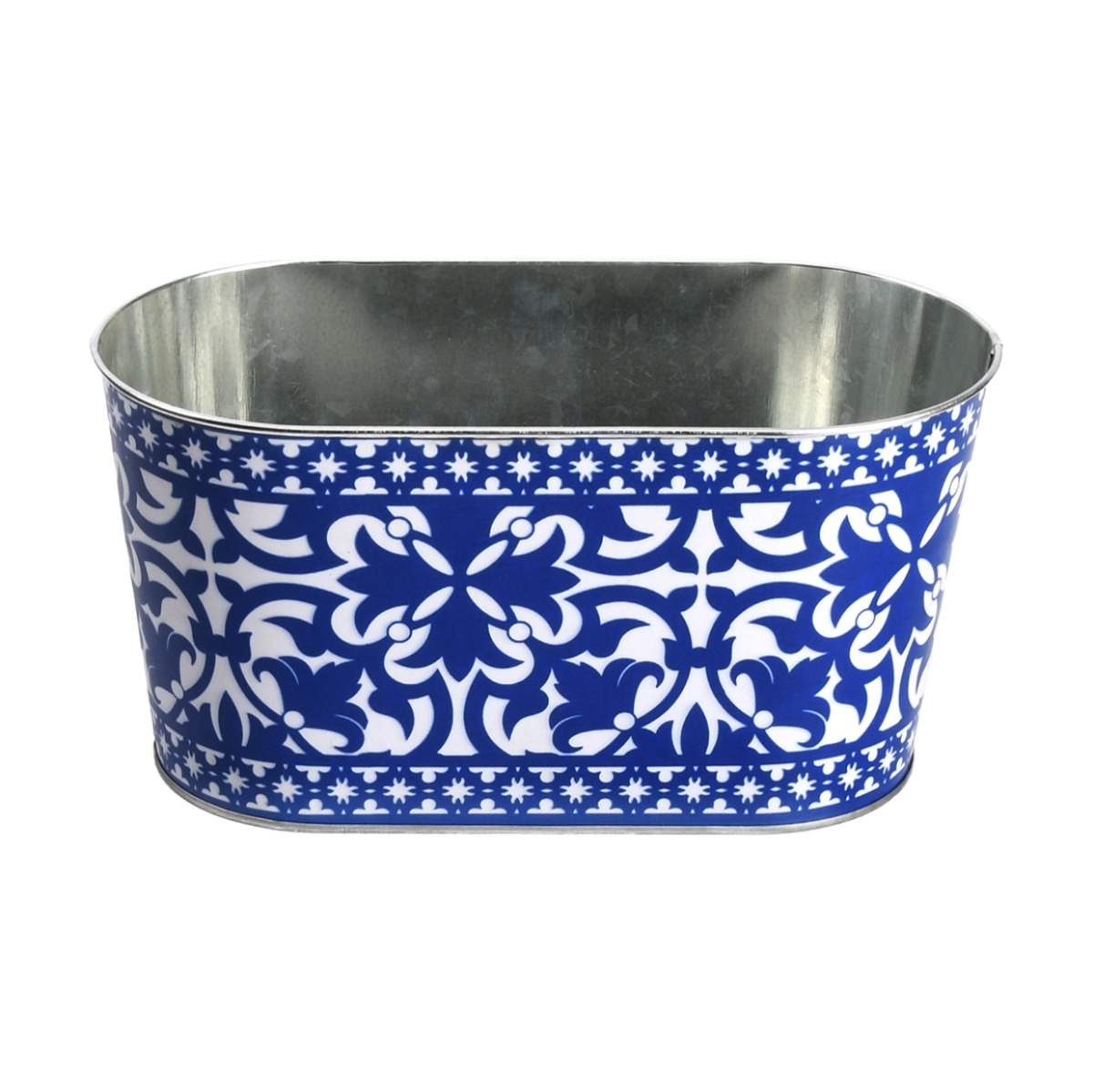 Oválny kvetináč je vyrobený zo zinku, s modrým a bielym vzorom, ktorý dáva výrobku stredomorský nádych.