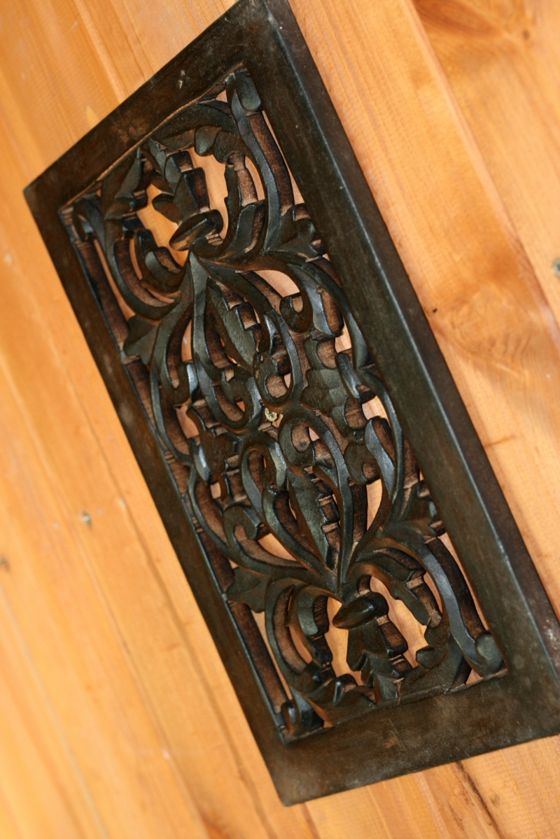 Tento z dreva vyrezávaný ozdobný panel vytvára na stene krásny "netradičné" obrazec. Dekorácia je vyrezaná z tmavého dreva, ktoré je doplnené patinou. Na jednej zo strán má panel dva kovové úchyty pre jednoduché pripevnenie.
