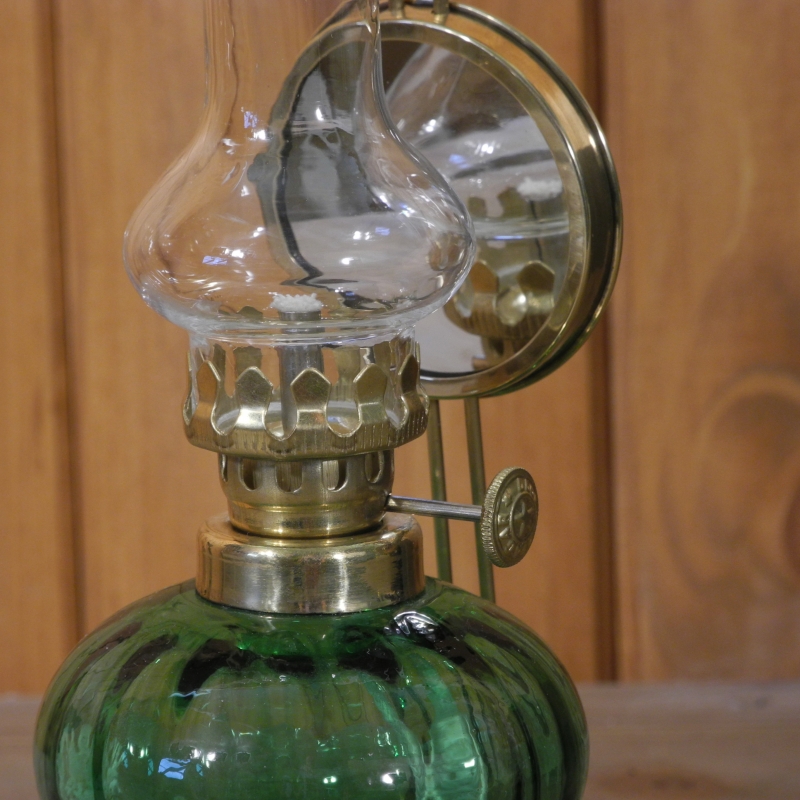 Petrolejka na obrázku je vysoká 17 cm a jej podstavec má priemer 7 cm. Môžete ju zavesiť na stenu a tešiť sa jej svetlom, ktoré sa vďaka zrkadielku za tienidlom bude nádherne rozlievať celým osvetľovali priestorom. Kovové časti petrolejky sú zlatisté, baňatá nádobka na petrolej má výraznú zelenú farbu.