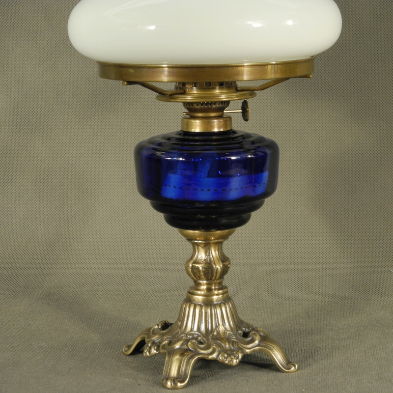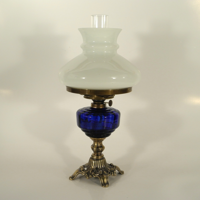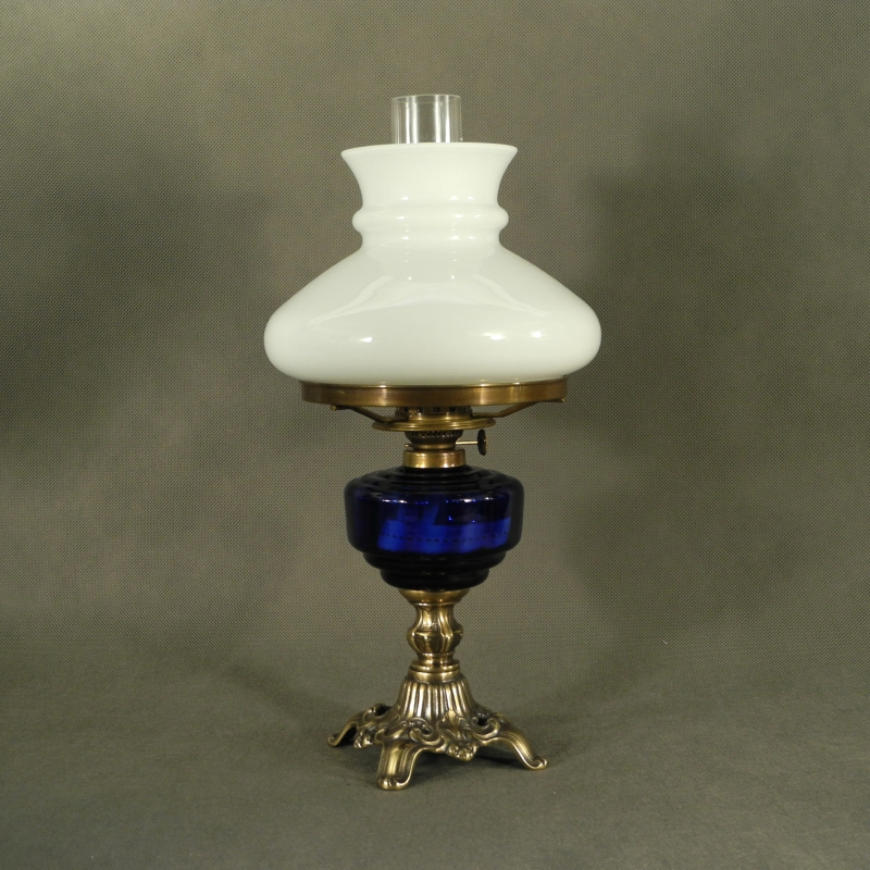 Petrolejka s podstavcom 11 x 11 cm má tmavo modrú guľatú nádobku na petrolej. Tienidlo je vo farbe bielej.