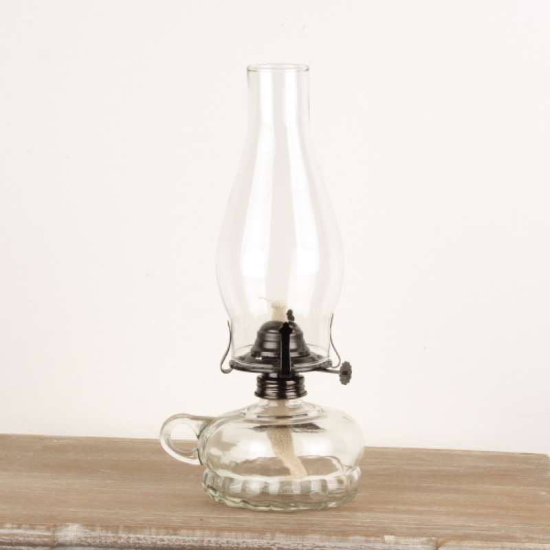 Petrolejová lampa číra 31cm má na nádobke na petrolej malé sklenené očko, za ktoré ju môžete ľahko prenášať.