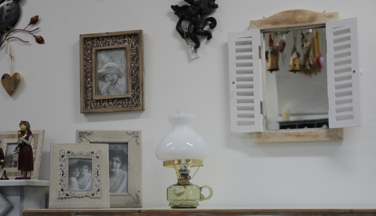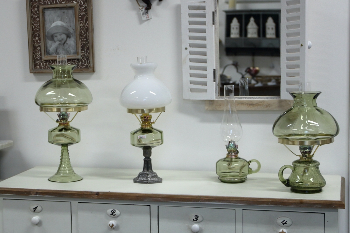 Petrolejová lampa v príjemnom zelinkavom odtieni, s cylindrom a bielym širmom.