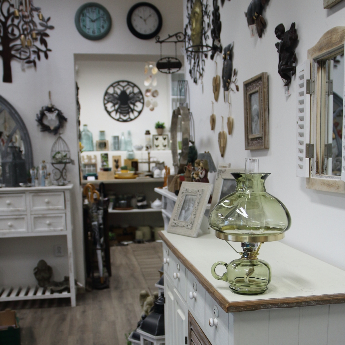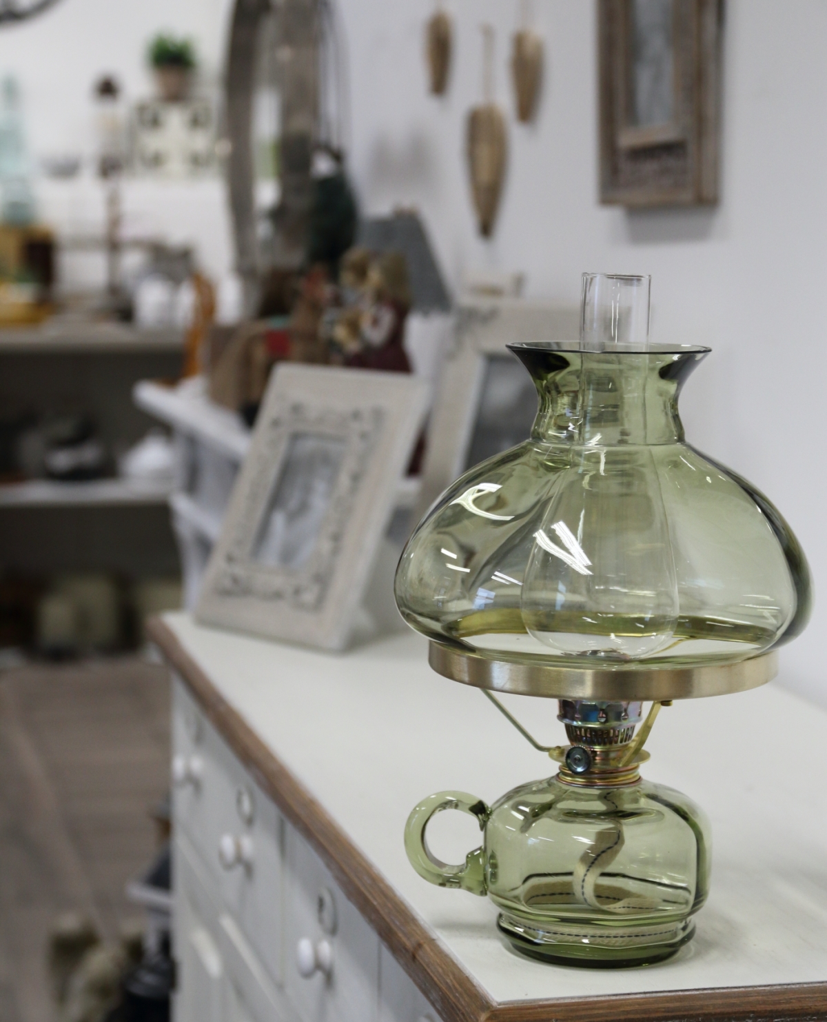 Petrolejová lampa v príjemnom zelinkavom odtieni, s cylindrom a zelinkavým tienidlom.