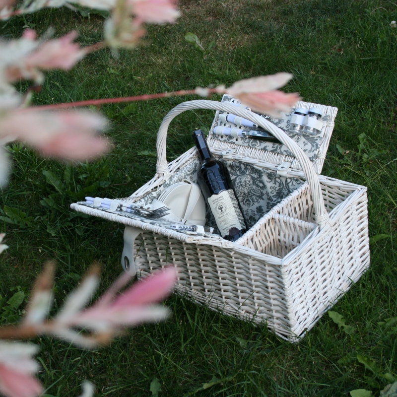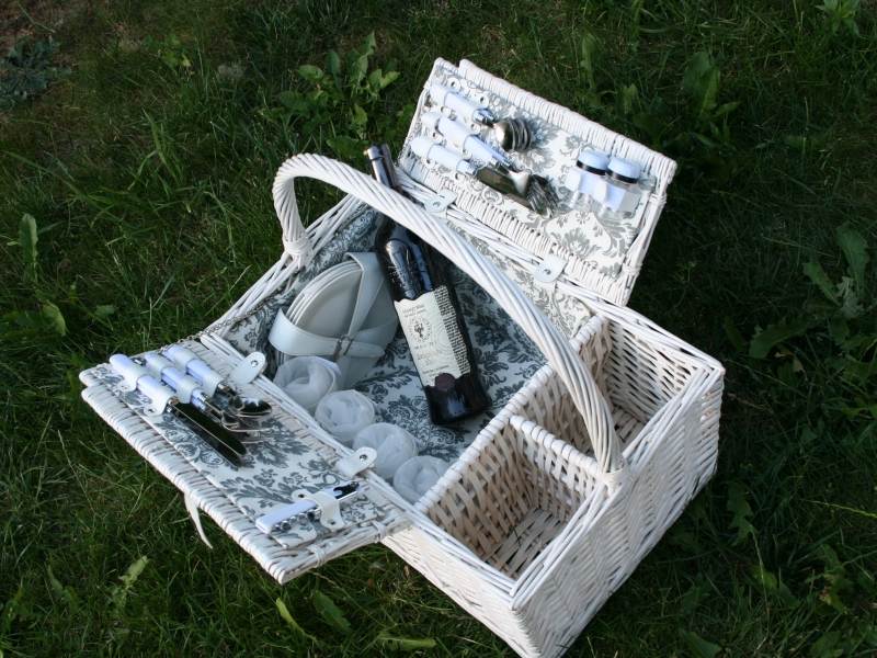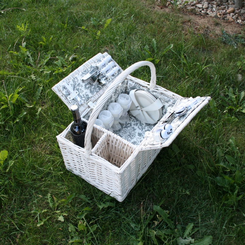 Piknikový kôš obsahuje: 4 tanieriky (porcelán), 4 vidličky, 4 nože, 4 kávové lyžičky, 4 poháre na víno (sklo). Každá vec má svoje miesto vďaka praktickým pásikom, ktoré zaisťujú bezpečné uloženie v koši a zabráni neporiadku pri prenášaní.