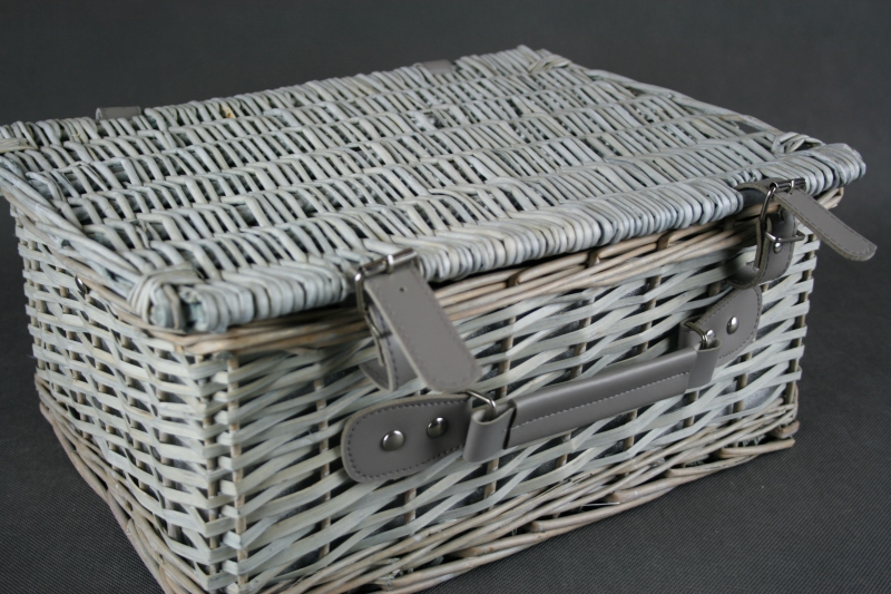 Popruhy na taniere, otvory na príbory a úchytky koše sú z koženky v šedej farbe.
