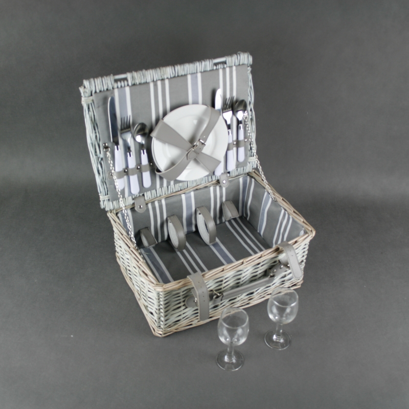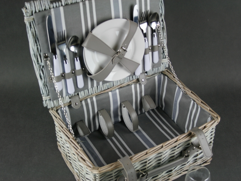 Veko koša je pripevnené k bočnej strane retiazky. Poháre v košoch sú vyrobené zo skla a tanieriky sú porcelánové. Stolovanie tak bude o to príjemnejšie.