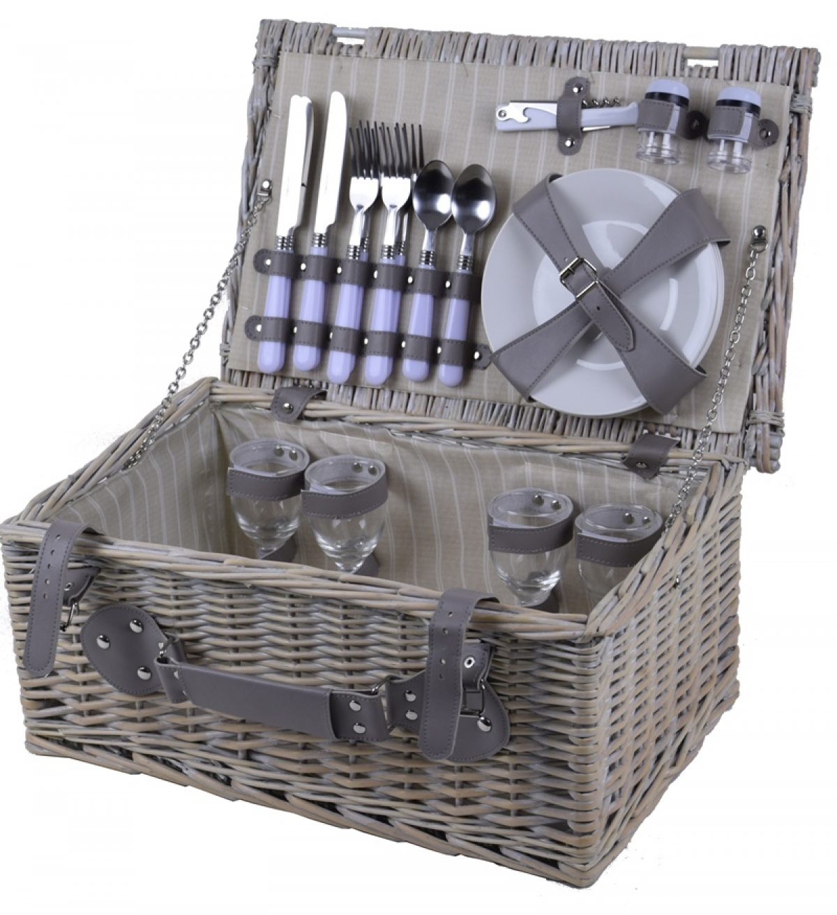 Piknikový kôš je plne vybavený pre stolovanie 4 osôb. Nájdete v ňom príbory, taniere, poháre, otvárač na víno i soľničku a koreničku.