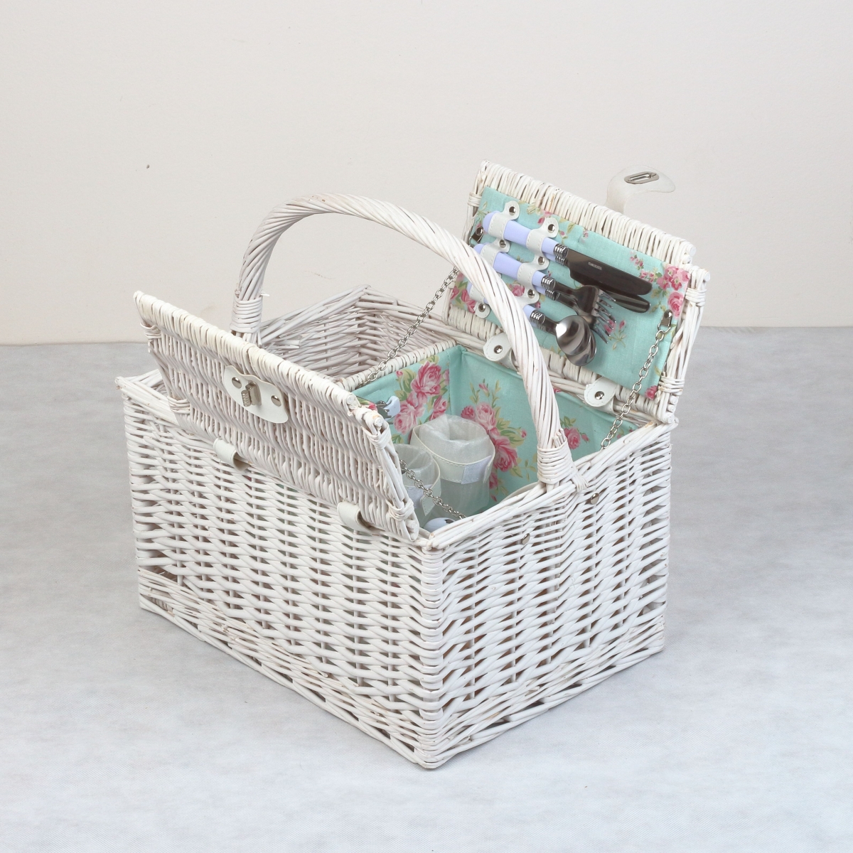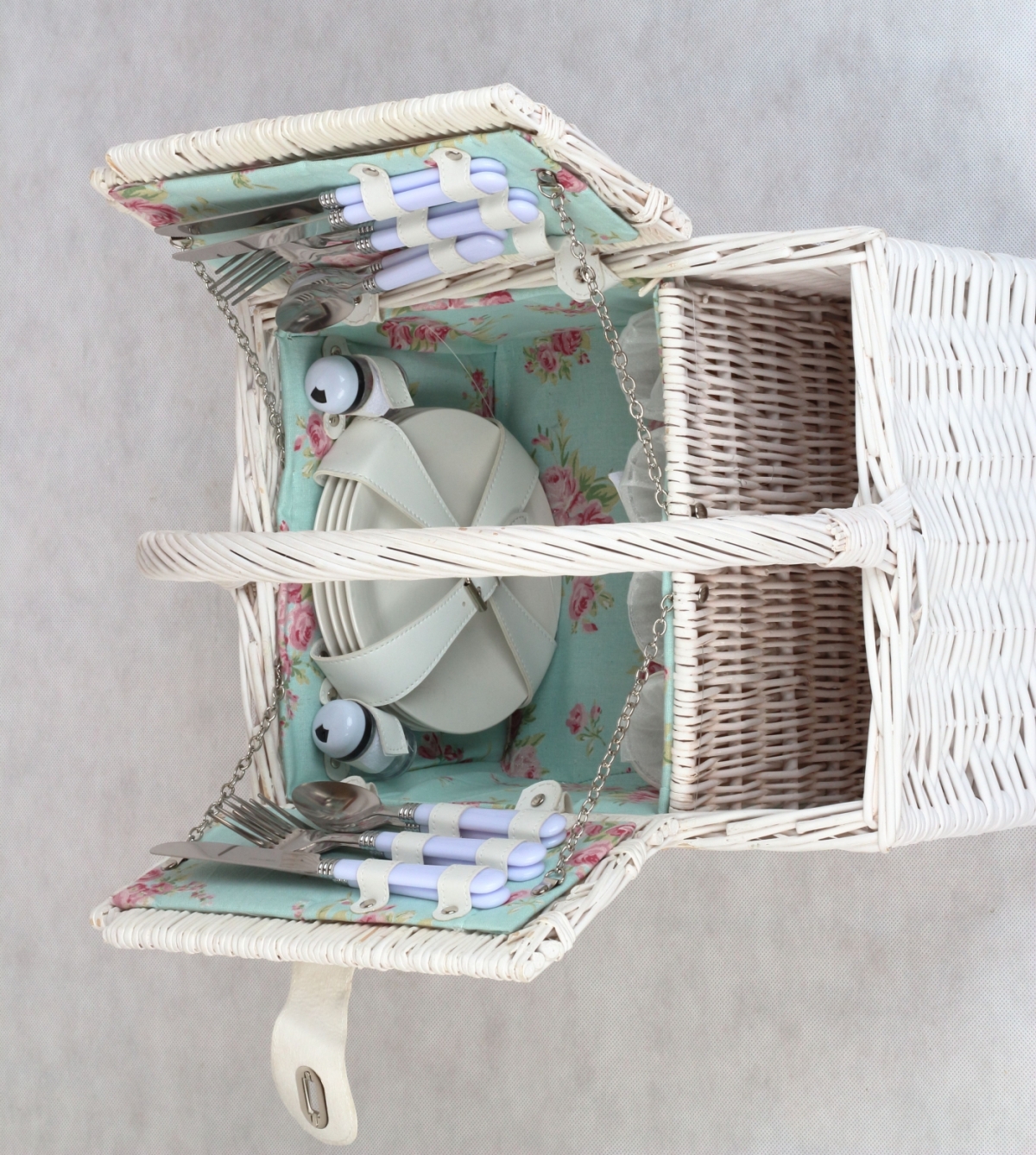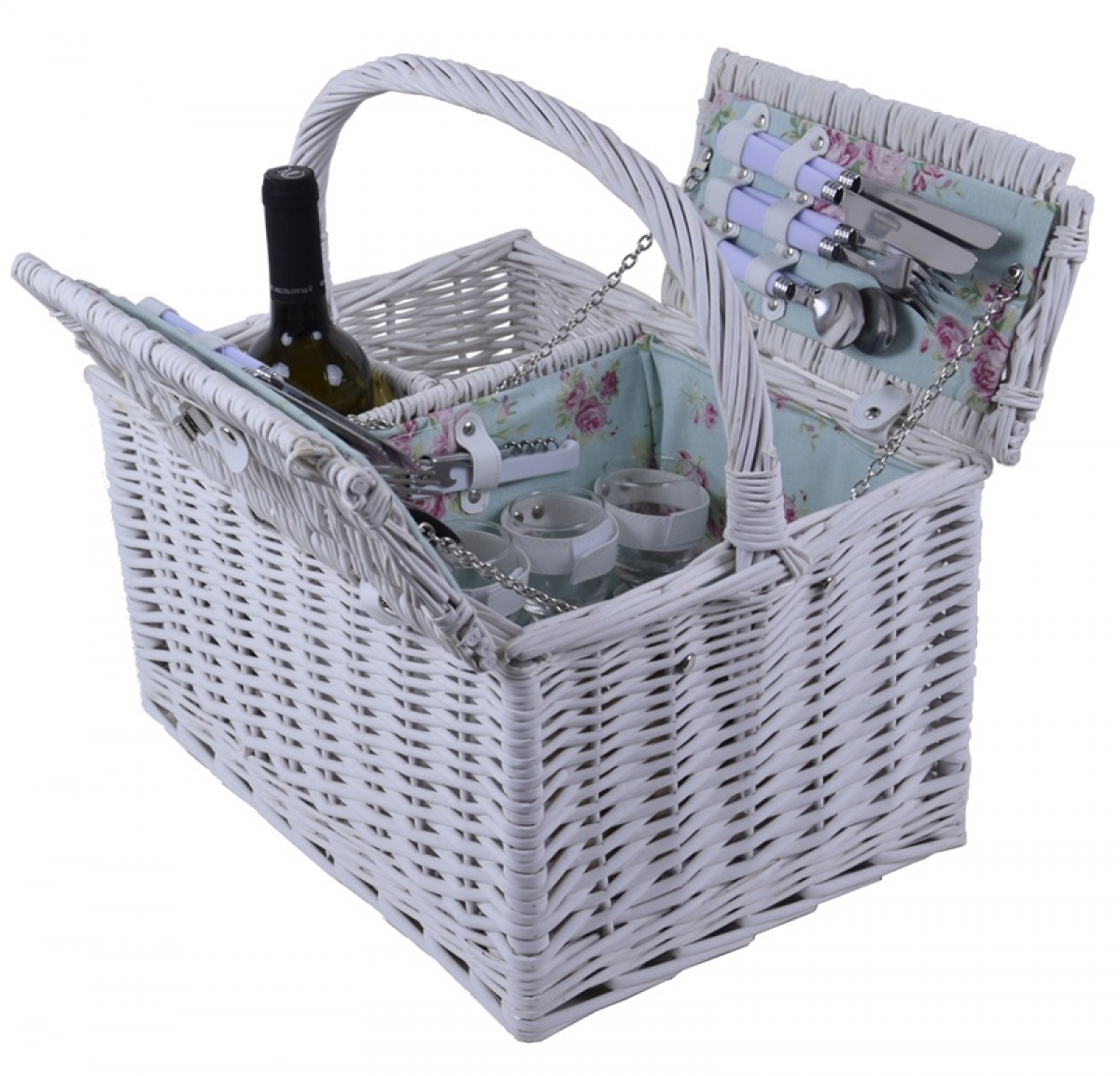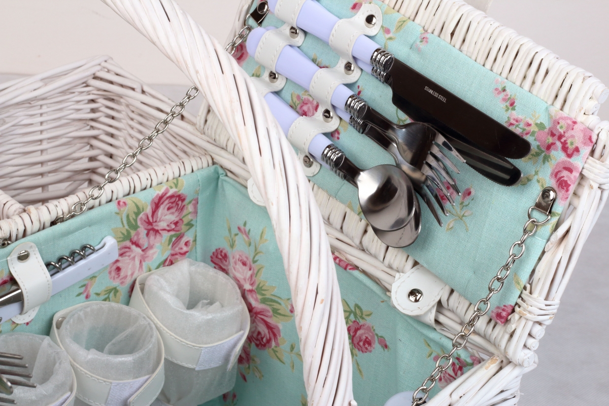 Piknikový kôš je plne vybavený pre stolovanie 4 osôb. Nájdete v ňom príbory, taniere, poháre i soľničku a koreničku.