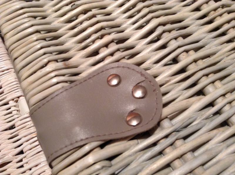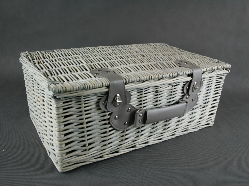 Popruhy na talíře, otvory na příbory a úchytky koše jsou z koženky v šedé barvě.