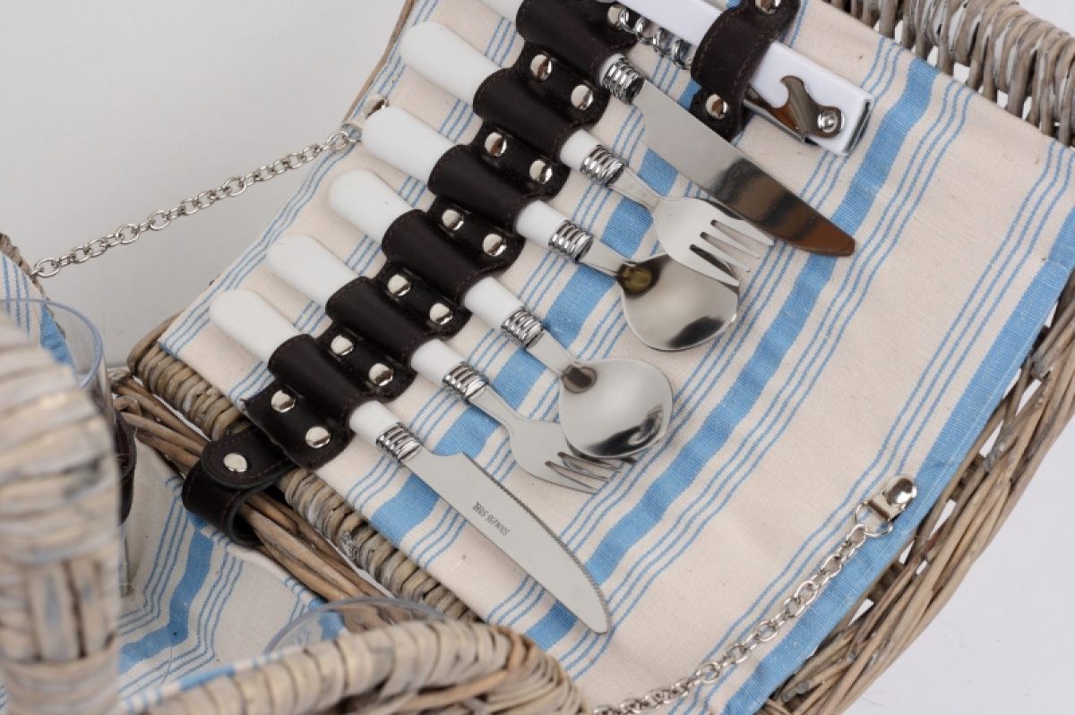 Piknikový kôš obsahuje taniere, príbory, poháre, soľničku, koreničku a otvárač na fľaše.