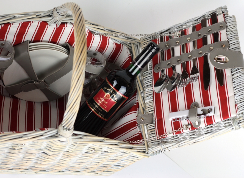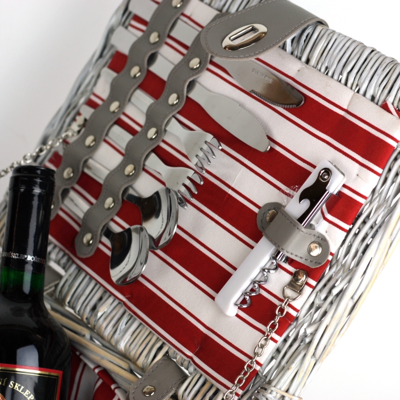Kôš obsahuje poháre, taniere, príbory, soľničku s koreničkou a otvárač na víno. Teda všetko, čo môžete pri stolovaní potrebovať. Jednotlivé veci sú bezpečne zaistené malými koženkovými popruhy, ktoré zabránia pohybu a prípadnému poškodeniu výbavy. Jedálenský set je šikovne v koši uložený a tak zostáva dostatok miesta na dobroty, ktoré sa vezmete so sebou.