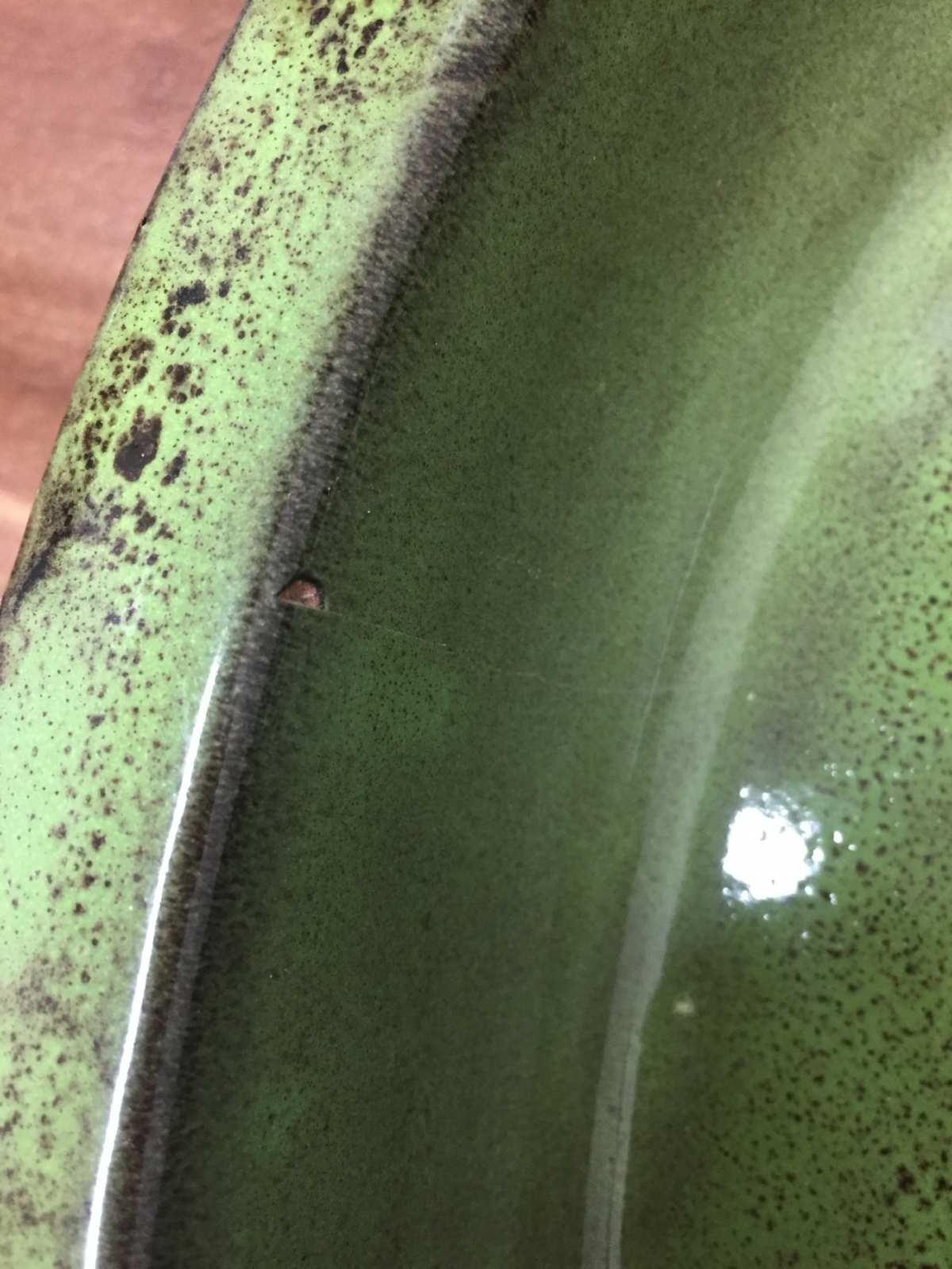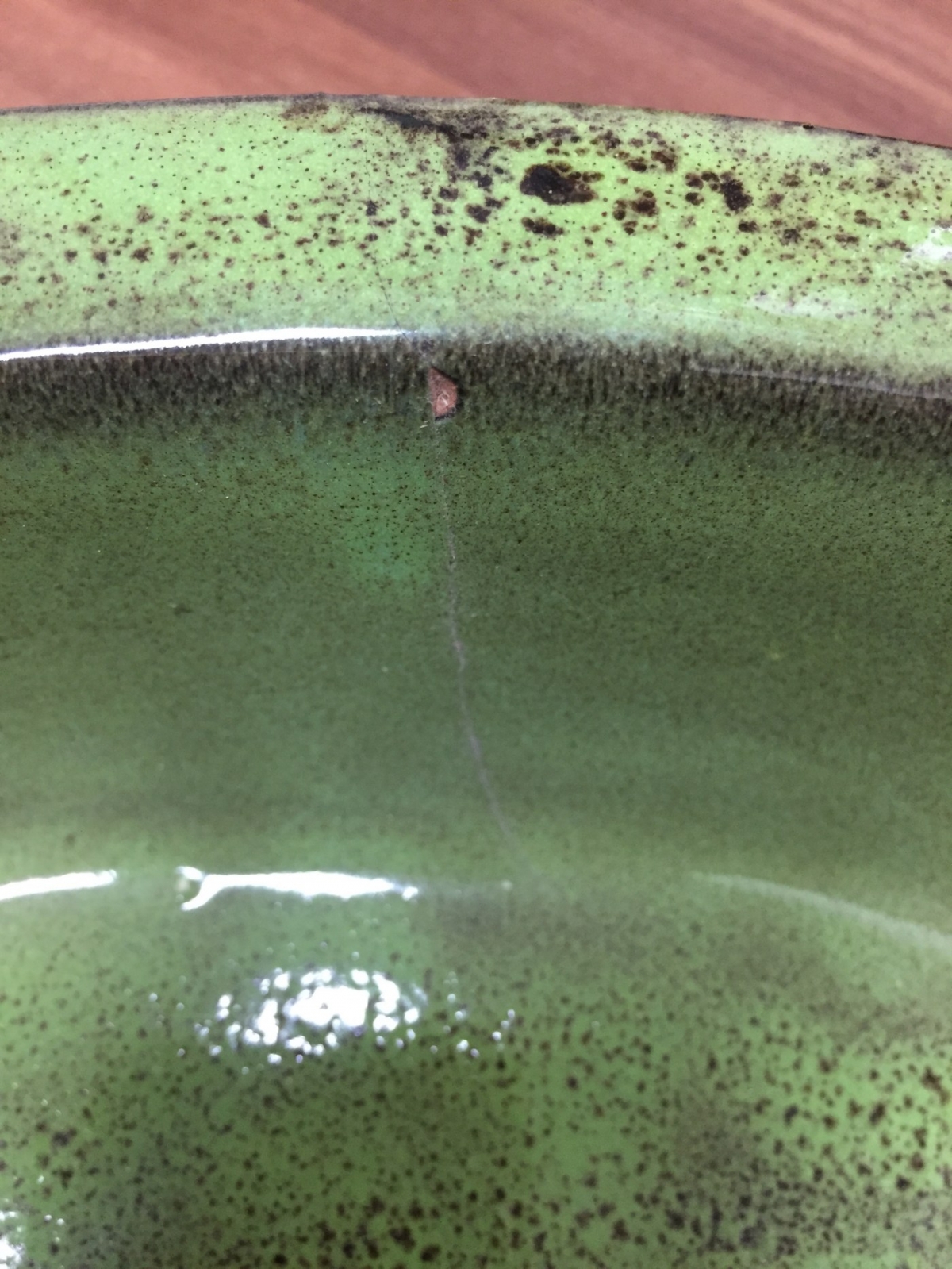 Pítko pre vtáčiky v tvare oválnej misky z keramiky v zelenej farbe je vyradené z dôvodu jemnej praskliny bočnej steny pítka. Voda po naliatí do misky iba mierne presakuje. Problém môže vyriešiť zatretie praskliny transparentným silikónom.
