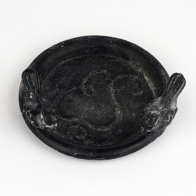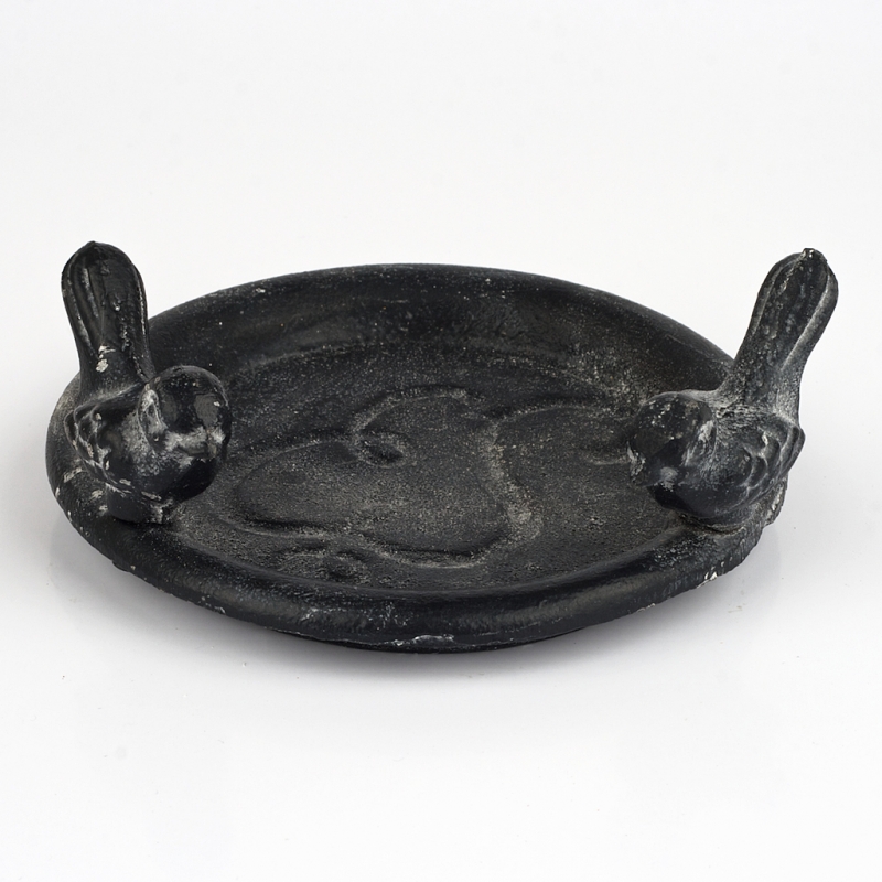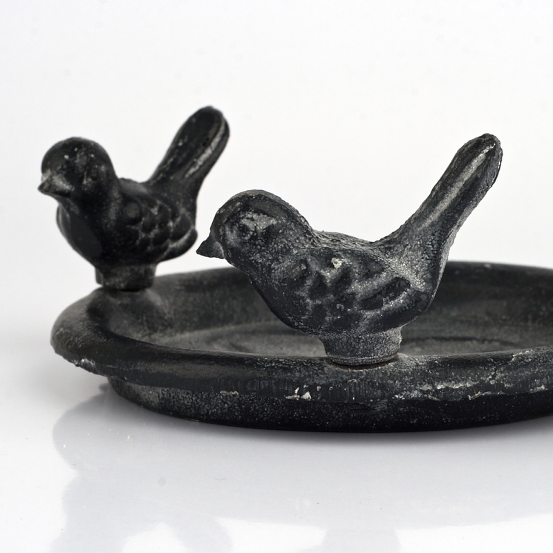 Materiál liatina, celkové vonkajšie rozmery: priemer 130 mm, výška po chvostík vtáčika 59 mm.