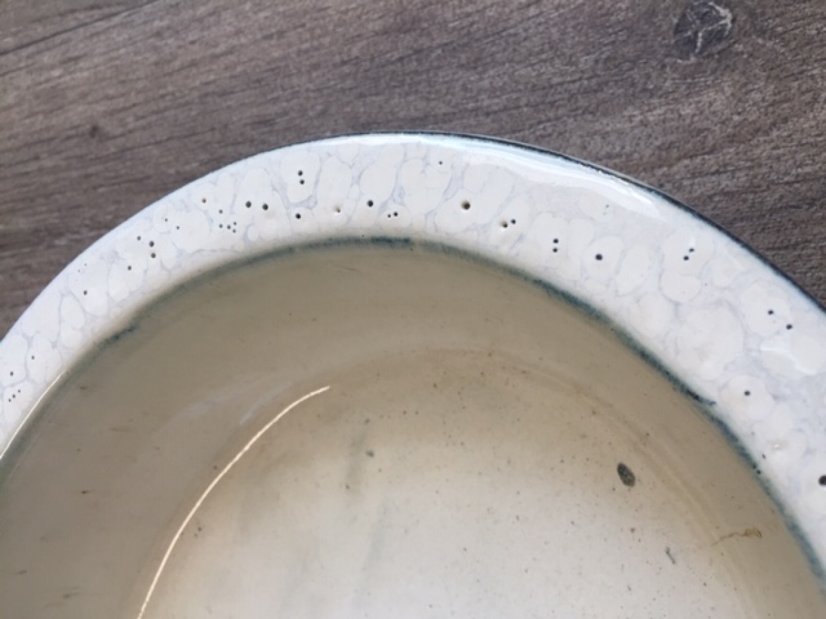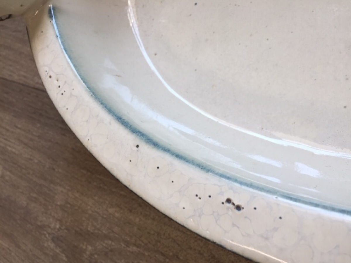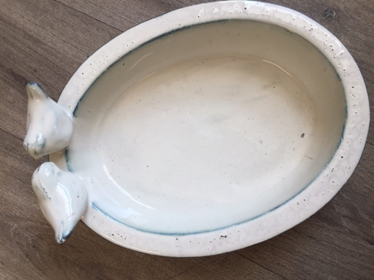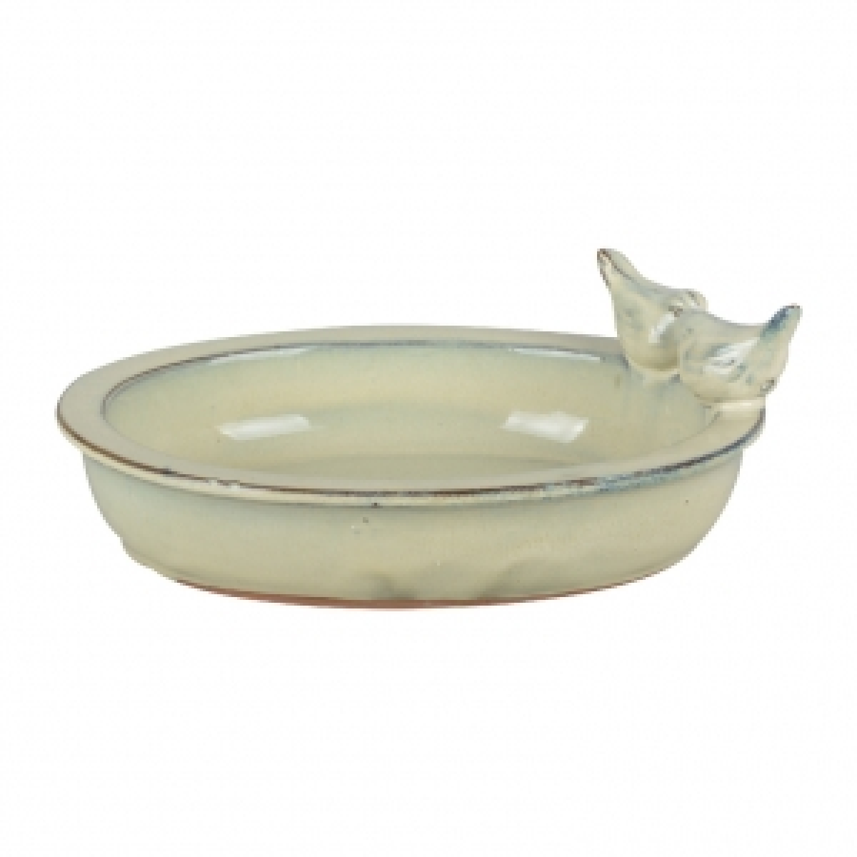 Pítko pre vtákov ako keramická oválna miska v krémovej farbe je vyradená z dôvodu poškodenia glazúry.
