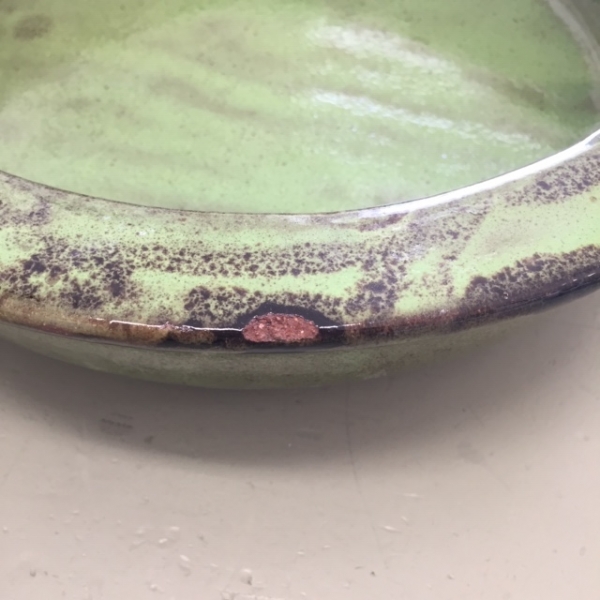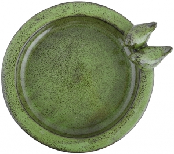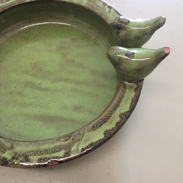 Zahradní pítko pro ptáčky v zelené barvě vyrobené z keramiky je vyřazeno z důvodu poškození na vaničce a na ocásku ptáčka.