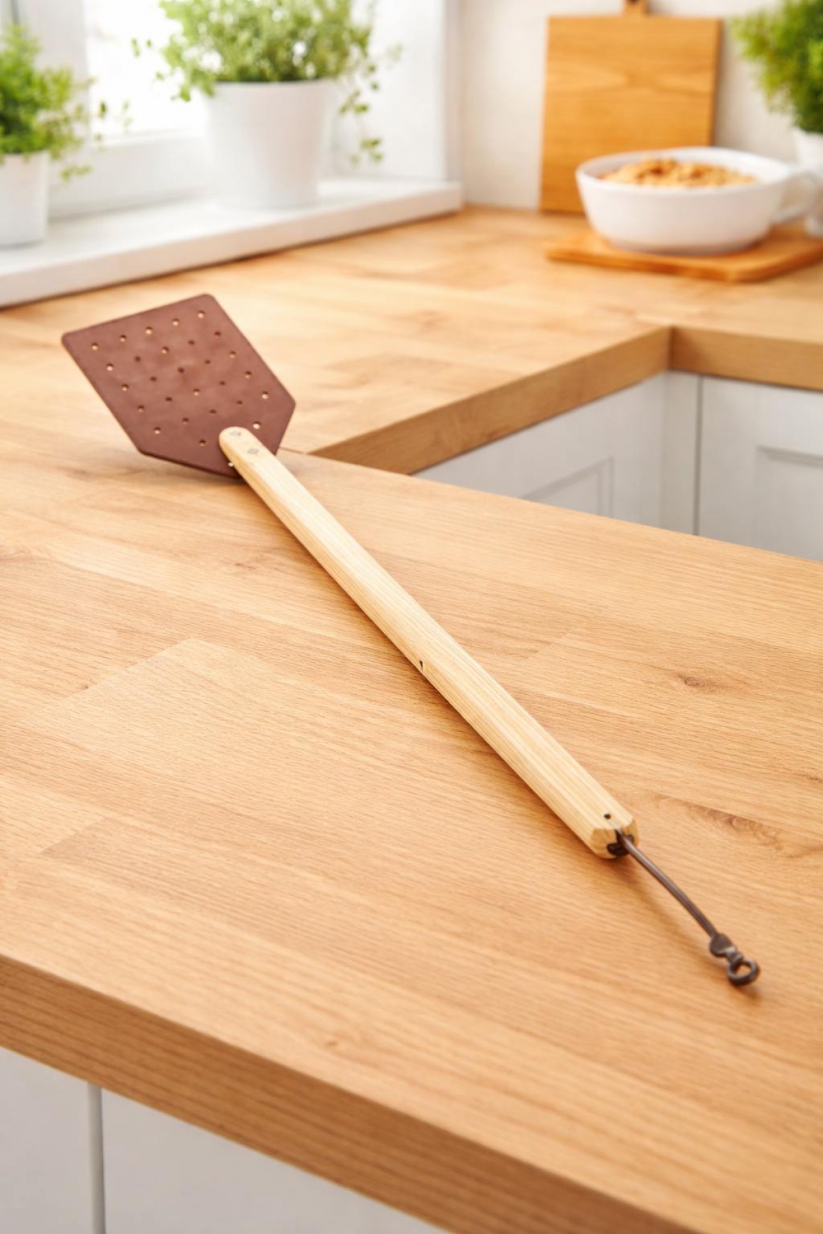 Kožená plácačka na muchy s drevenou rukoväťou opatrenú pútkom pre zavesenie.
