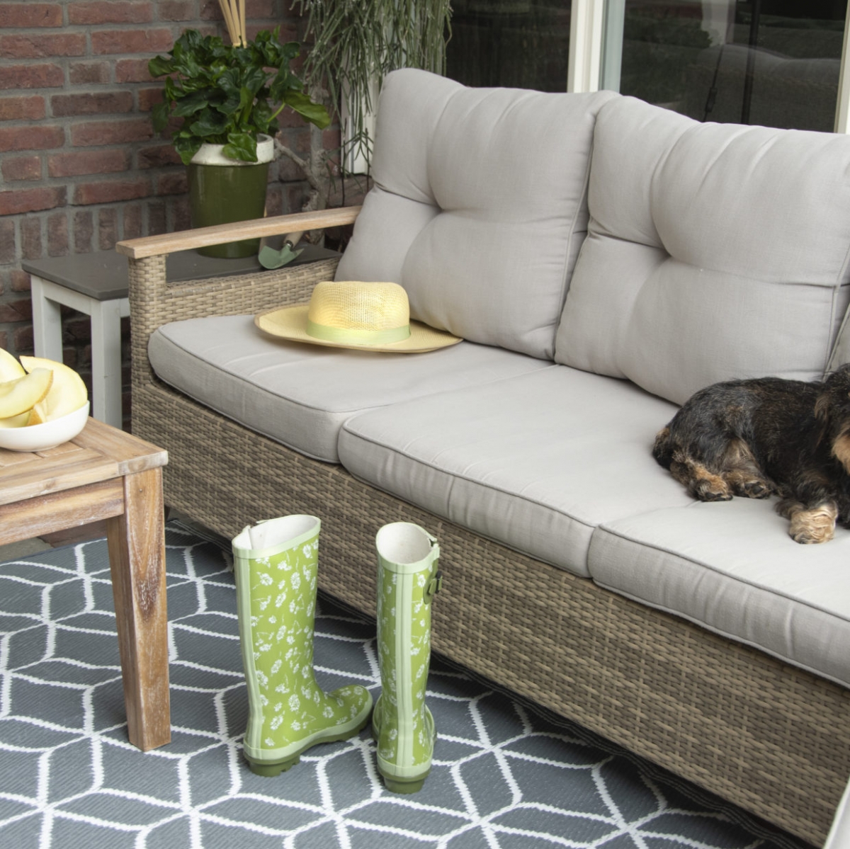 Plastový koberec na záhradu alebo terasu, s šedo-bielymi ornamentmi