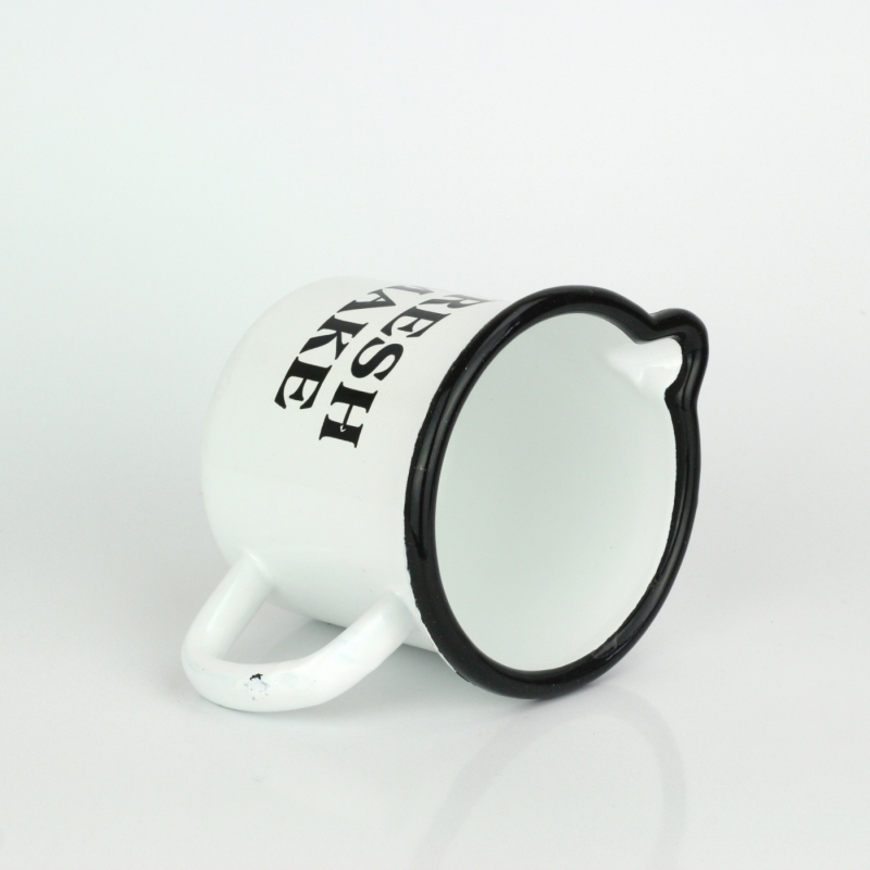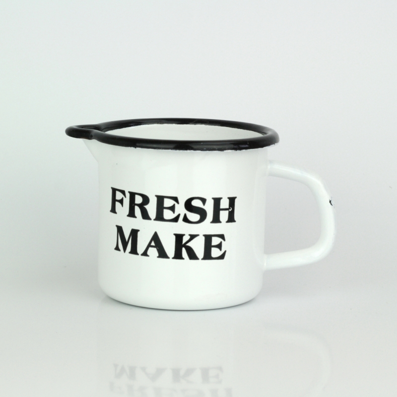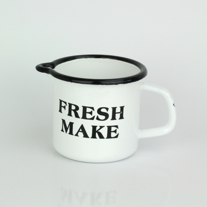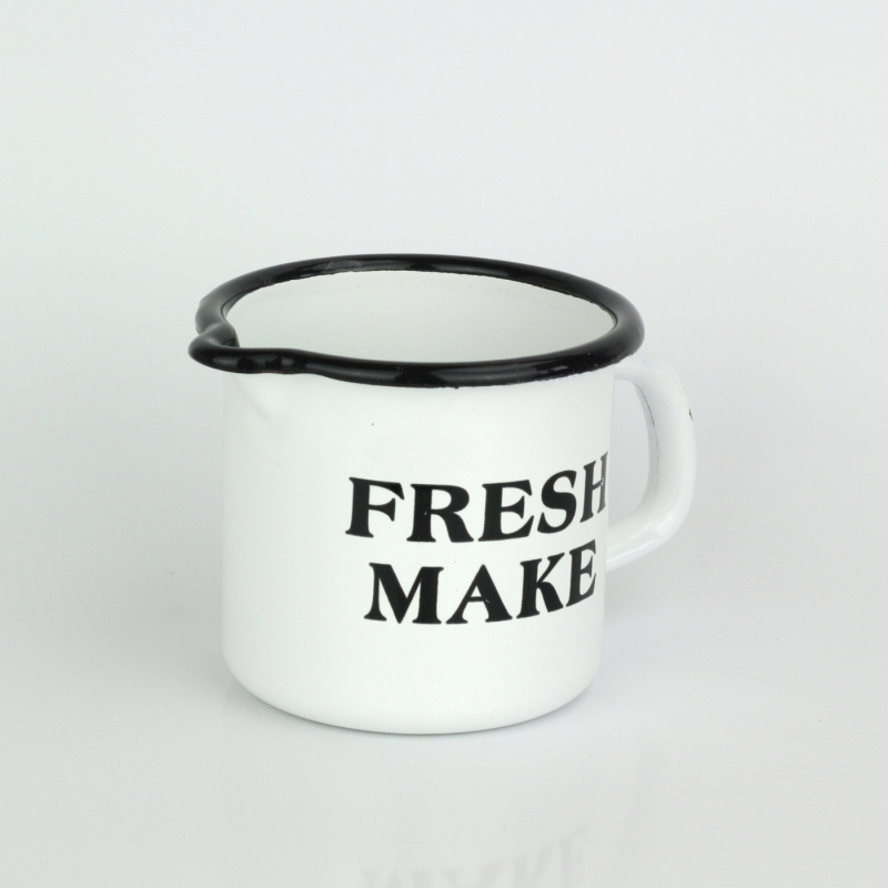 Štýlový plechový hrnček s výlevkou využijete v kuchyni doma i na chalupe. Biely plecháčik s čiernymi okrajmi a nápisom FRESH MAKE.