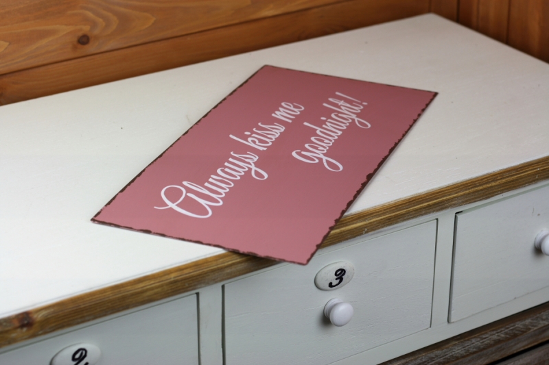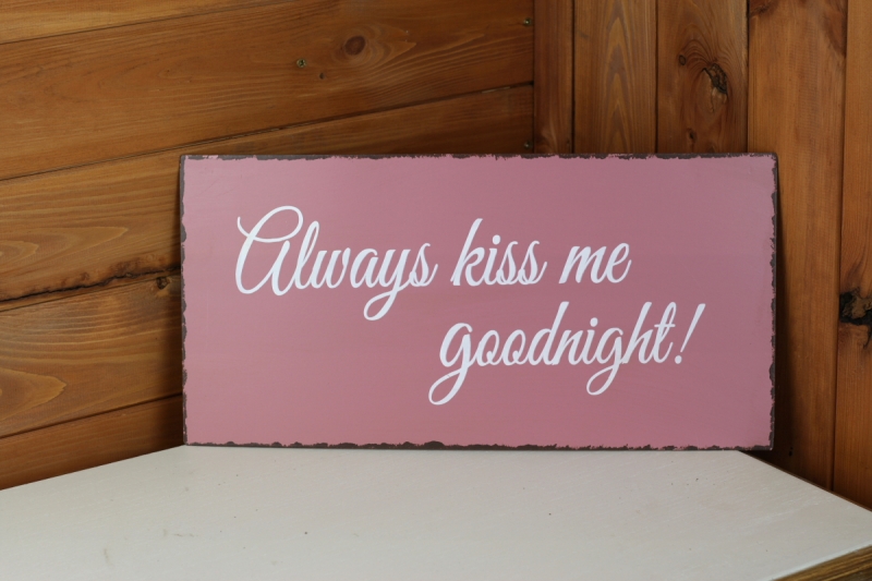 Cedule s anglickým nápisom Always kiss me goodnight sa hodí ako dekorácia do spálne. Zo zadnej strany sú výstupky pre zavesenie na klinčeky.