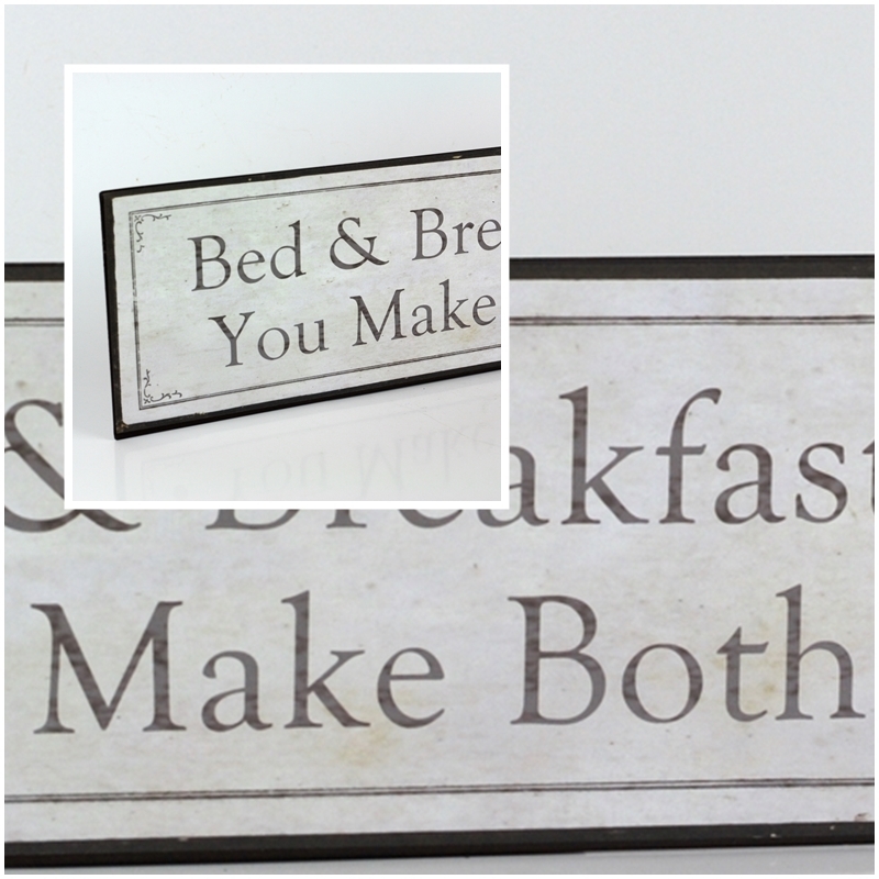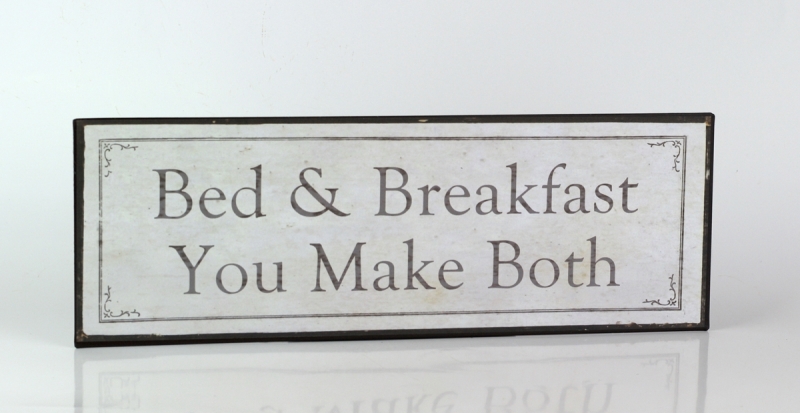 Plechová ceduľa s nápisom "Bed & breakfast you make both".