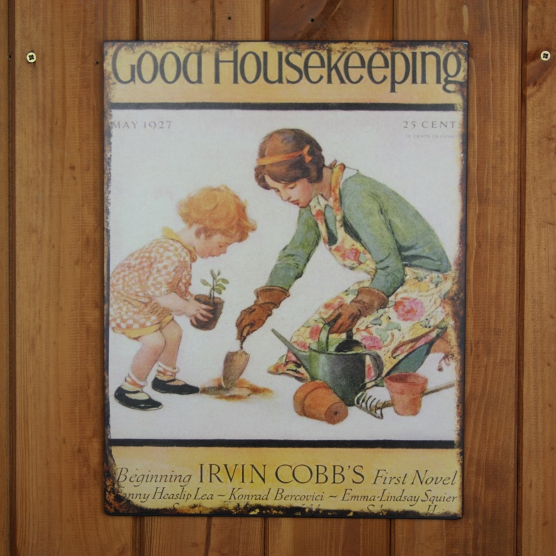 Plechová ceduľa zobrazuje matku s dcérou pri spoločných záhradných prácach.