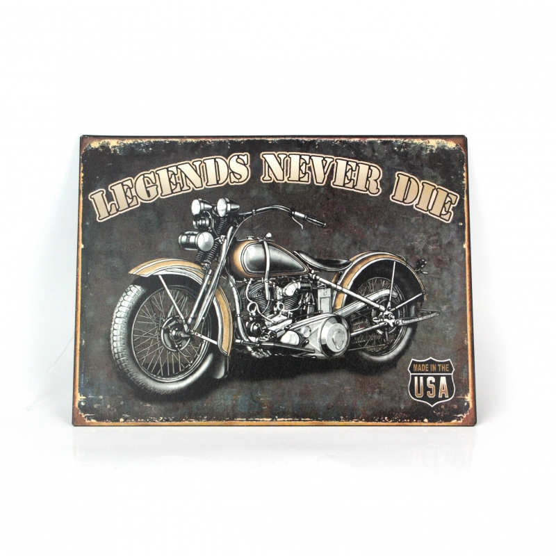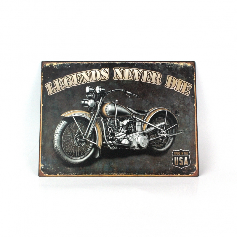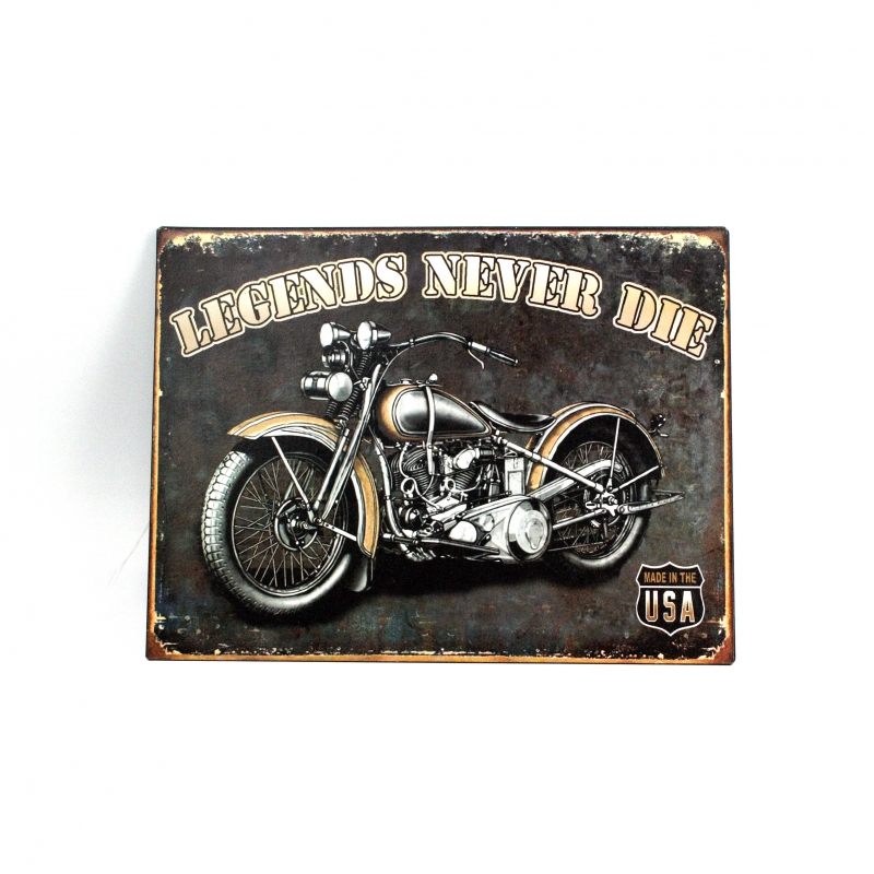 Ceduľa s nápisom Legends never die alebo ak Legendy nikdy neumierajú je doplnená o podobizeň silné mašiny.