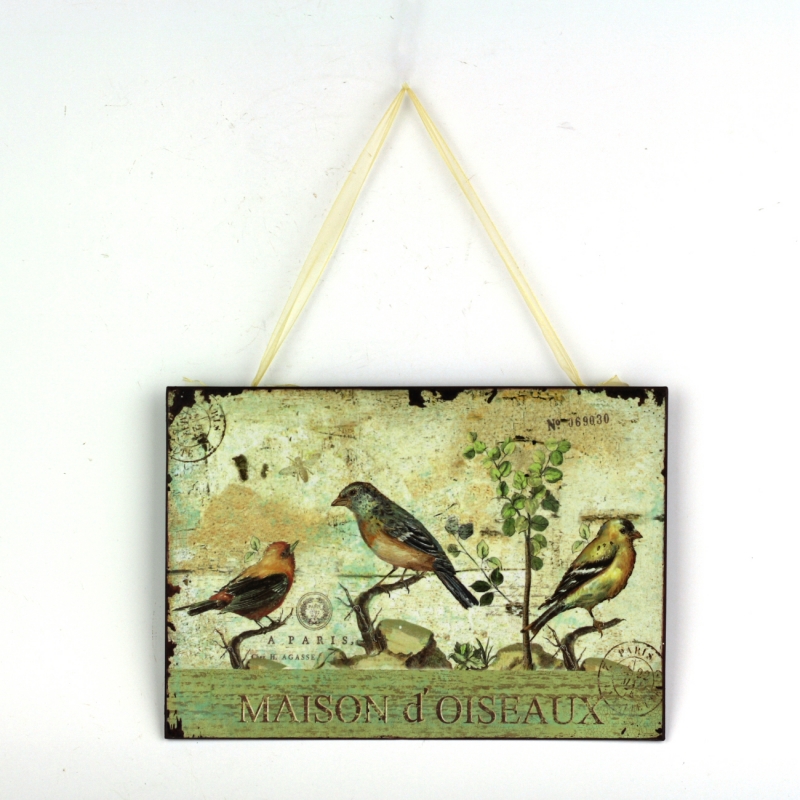 Plechová ceduľa tri vtáčiky slúži na zavesenie na stenu ako dekorácia. Vďaka pripevnené stužke to pôjde veľmi ľahko.