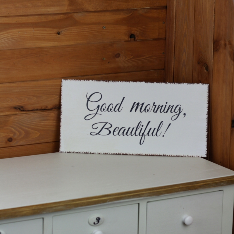 Okraje ceduľa s otlčeným vzhľadom sú typické pre vintage štýl. Ceduľa s nápisom Good morning, beautiful! vyčarí úsmev na tvári každej ženy.