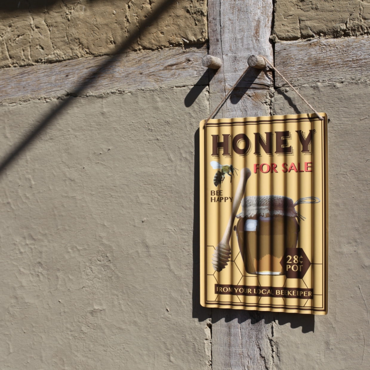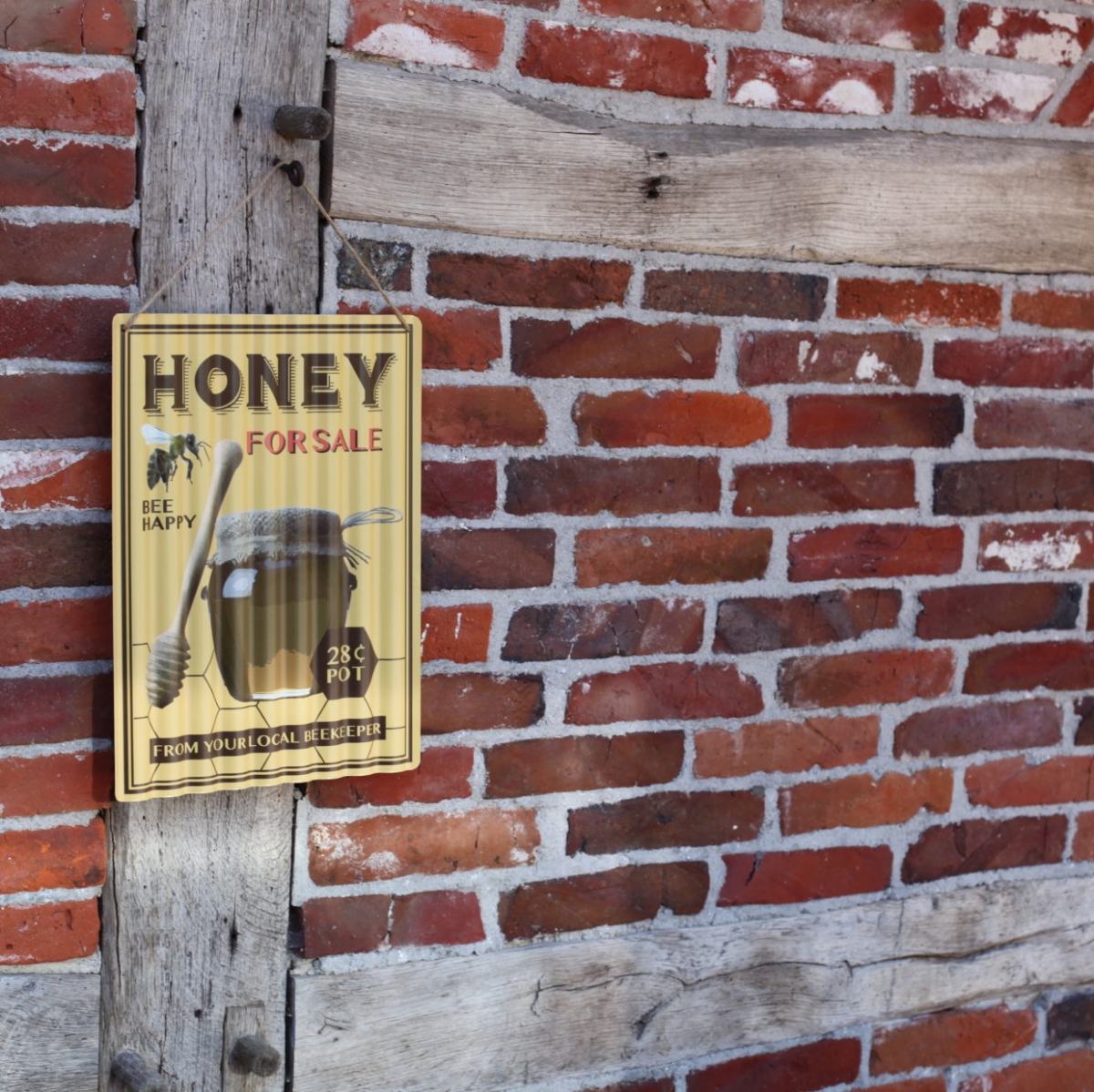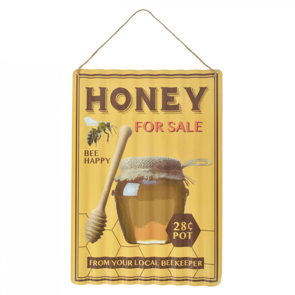 Plechová ceduľa s nápisom med na predaj ako štýlová dekorácia do kuchyne alebo ako dar pre včelárov. Je vybavená jutovým pruhom pre ľahké zavesenie.