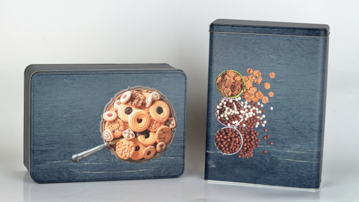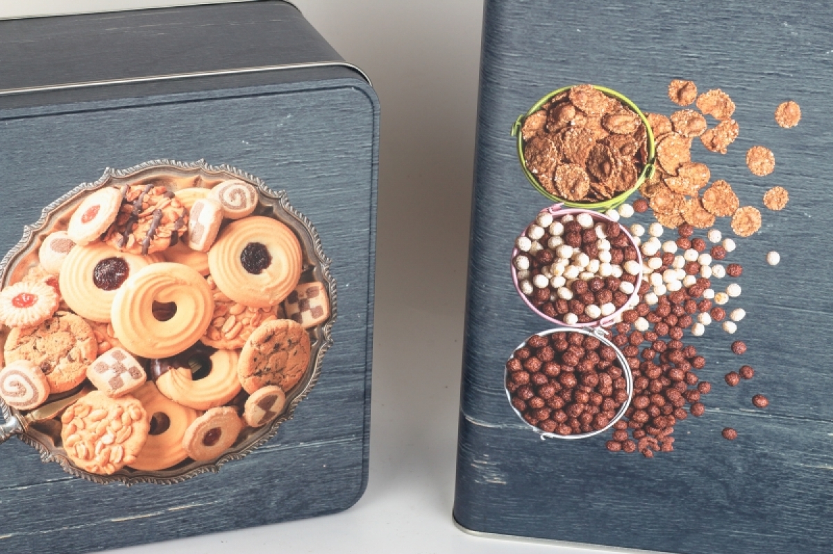Plechová dóza na sušienky v retro štýle s potlačou.