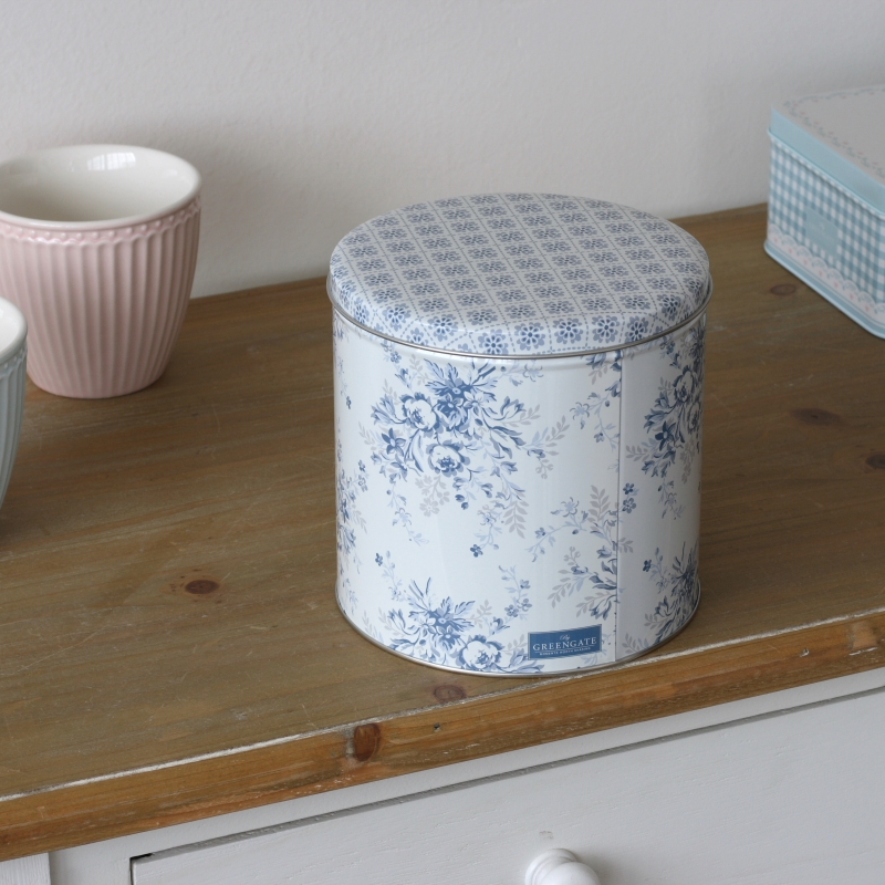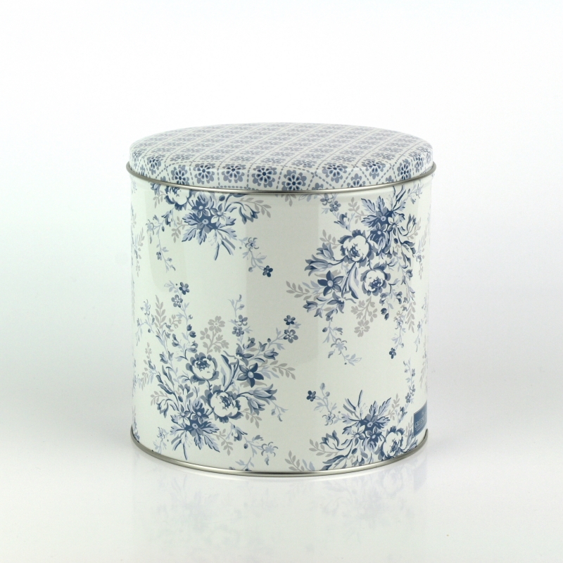 Plechová guľatá dóza Sadie blue 13,5cm v prekrásnej bielo modrom prevedení s kvetinovým motívom drobnými kvietkami na viečku. Dóza je všestranný kuchynský pomocník. Môžete do nej ukryť sladkosti pre deti, upečené sušienky alebo akékoľvek potraviny.