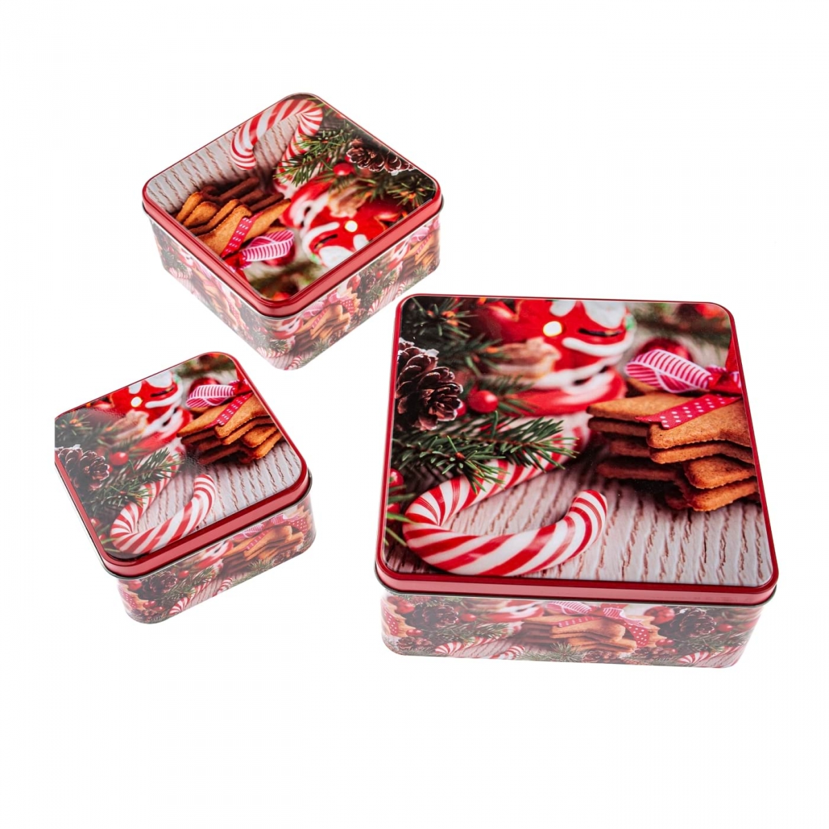 Súprava 3 plechových dóz na perníčky – najväčšia 20 × 20 × 8 cm, zvyšné vložené v sebe.