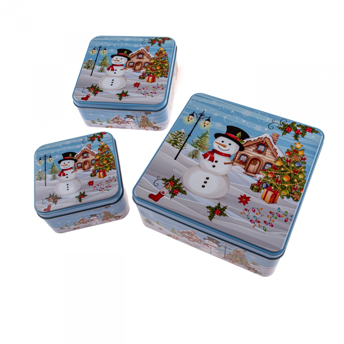 Sada 3 plechových dóz na vianočné pečivo – najväčšie 20 × 20 × 8 cm, zvyšné vložené v sebe.