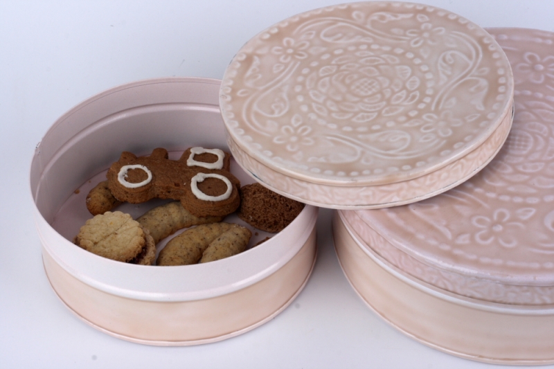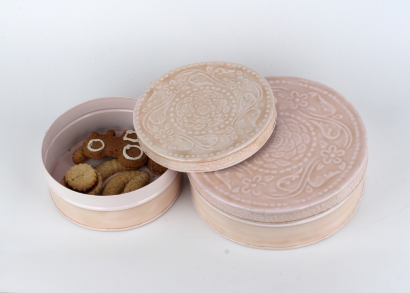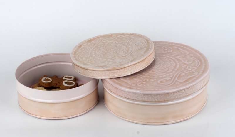 Plechové okrúhle dózy sa zdobeným vekom 2ks v nežnom romantickom štýle môžete využiť na uskladnenie drobností alebo napríklad sladkostí pre deti.