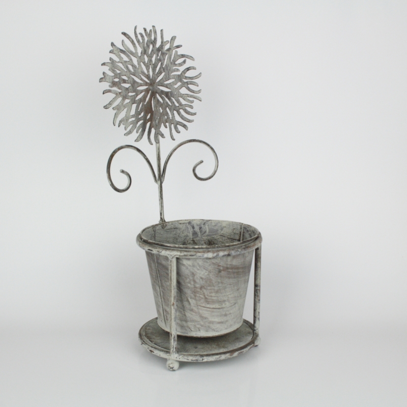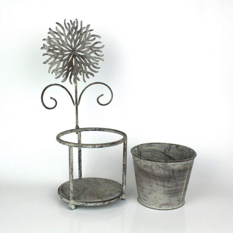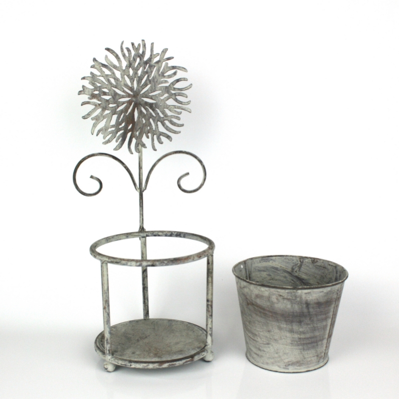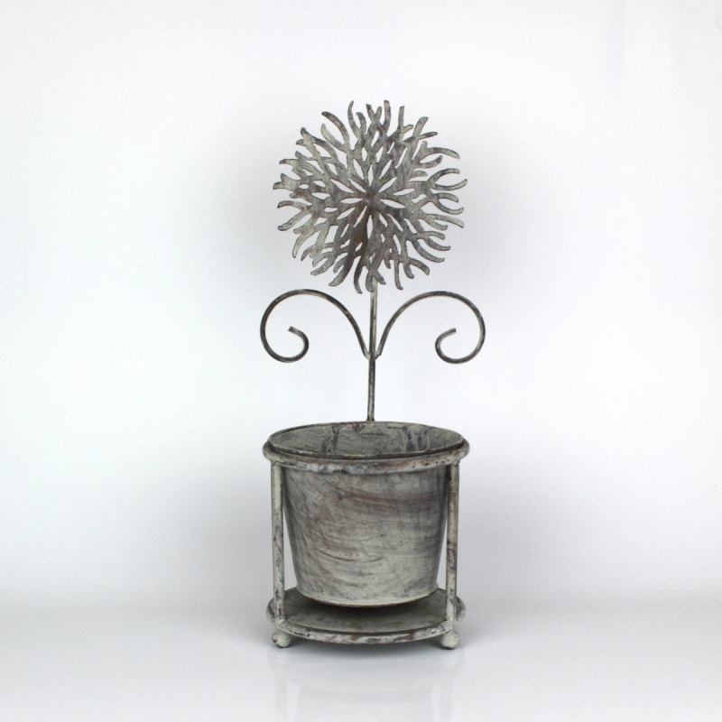 Kvetináč je vsadený do kovového stojanu, nad ktorým sa týči ozdobný kovová kvetina.