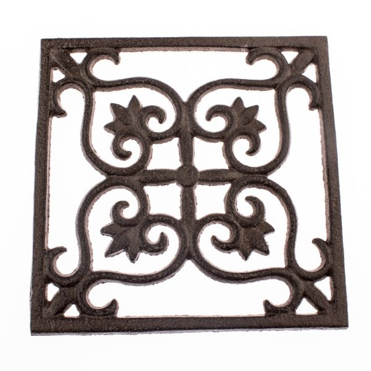Podložka pod hrnce z liatiny v štvorcovom tvare s ozdobnými ornamentami.