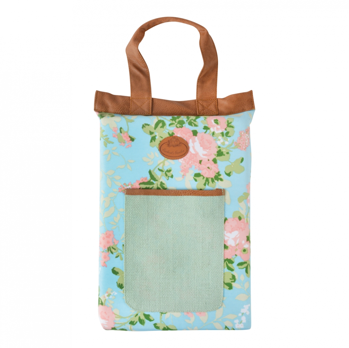 Každé romantické srdce zaplesá nad touto podložkou pod kolená. Plátno s motívom ruží so zelenými lístkami na svetle modrom podklade, je doplnené zelenym vreckom z juty a hnedým uchom a lemovaním z koženky.