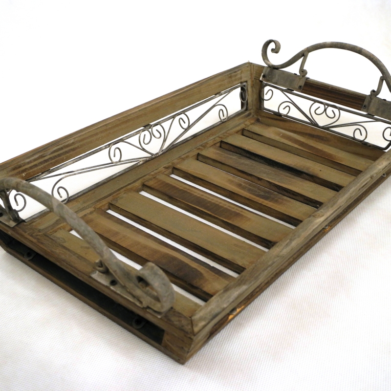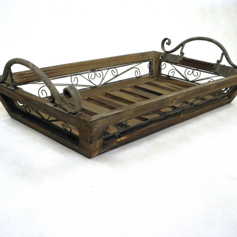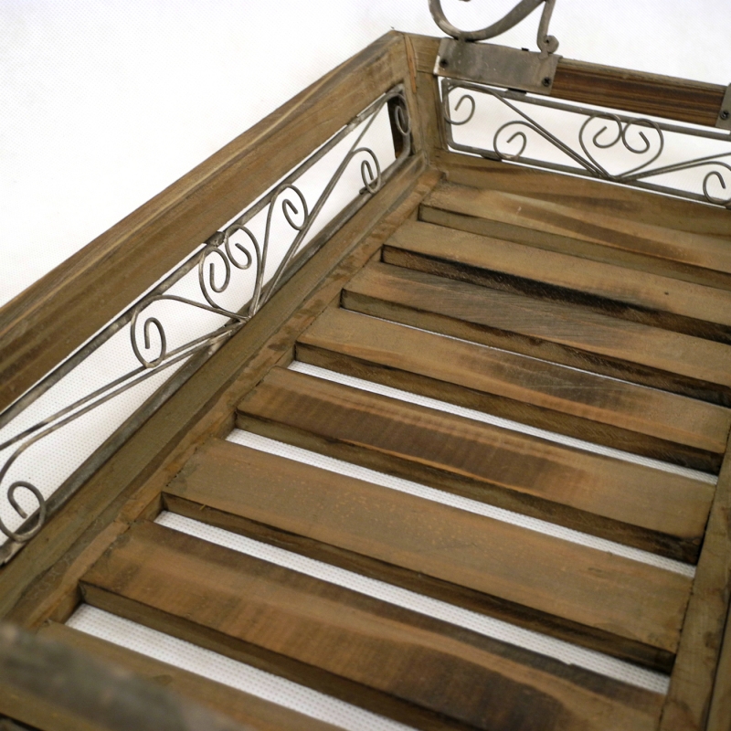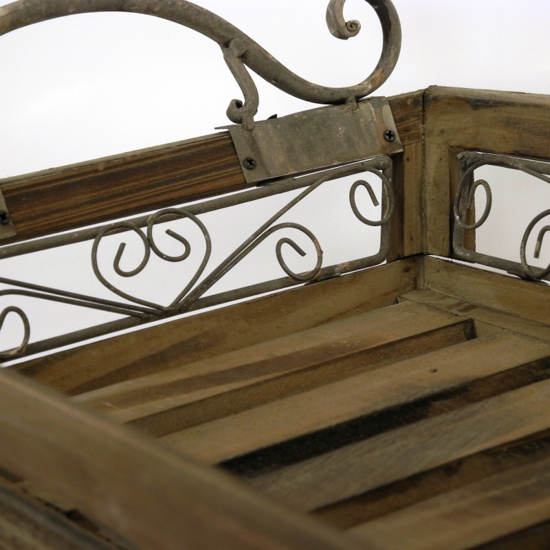 Podnos na záhradu 47x28cm v retro štýle, je vyrobený z dreva a zdobený kovovými ručne vyrábanými ozdobami v bočných častiach podnose.