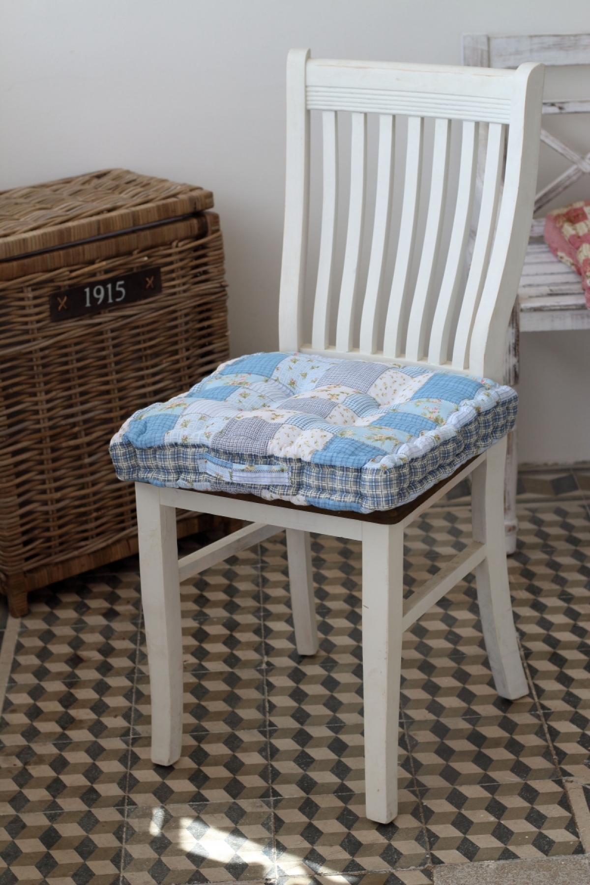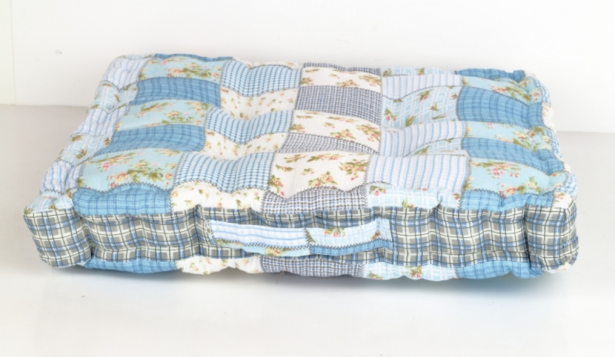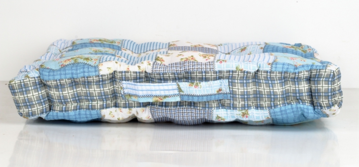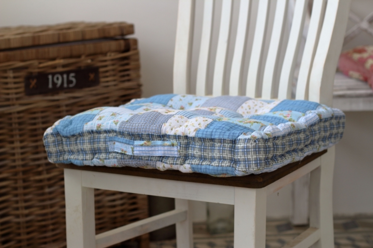 Podsedák na stoličku modrý patchwork 45x45cm perfektne doladia interiér s vidieckym nádychom a hosťom ponúkne pohodlné sedenie.