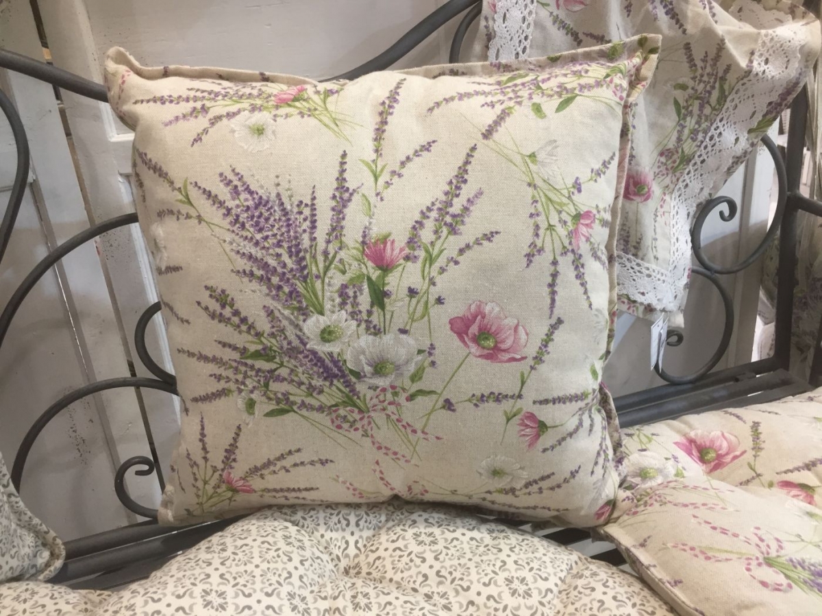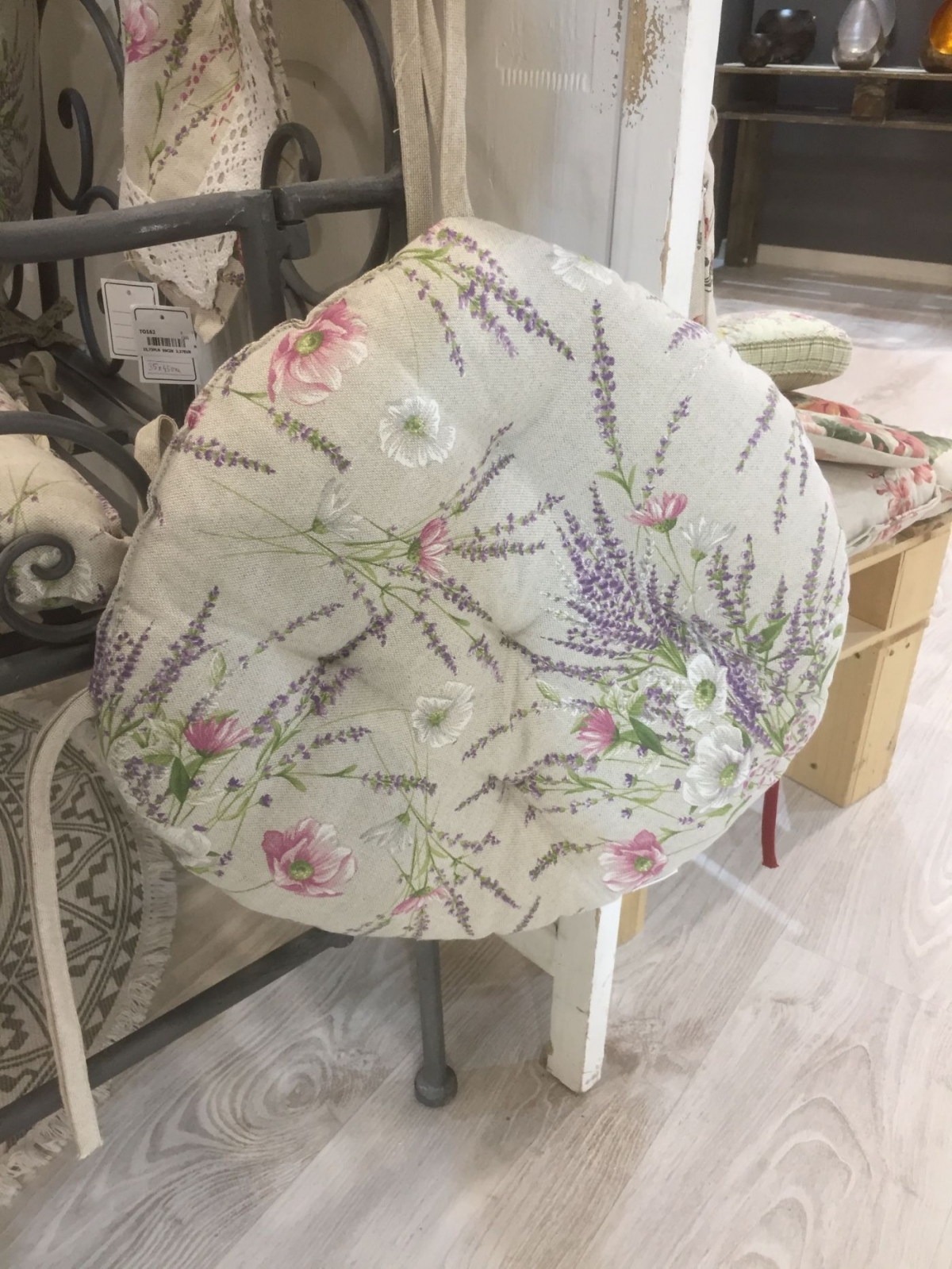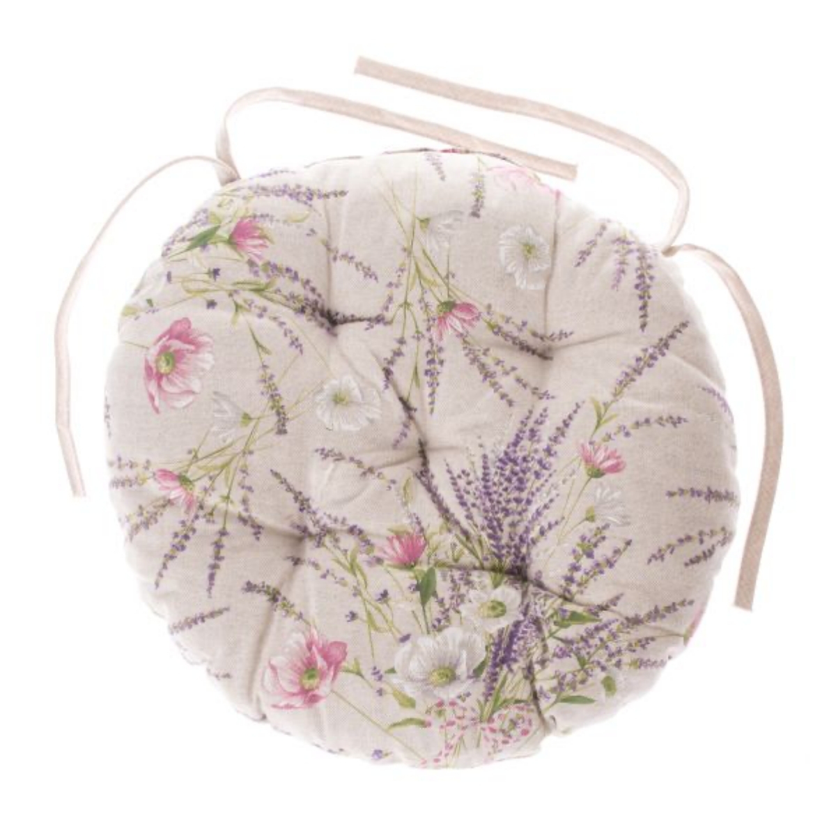 Podsedáky na stoličky so vzorom rozkvitnutej levandule, môžete doplniť bytovým textilom rovnakého vzoru, v mnohých rôznych prevedeniach.