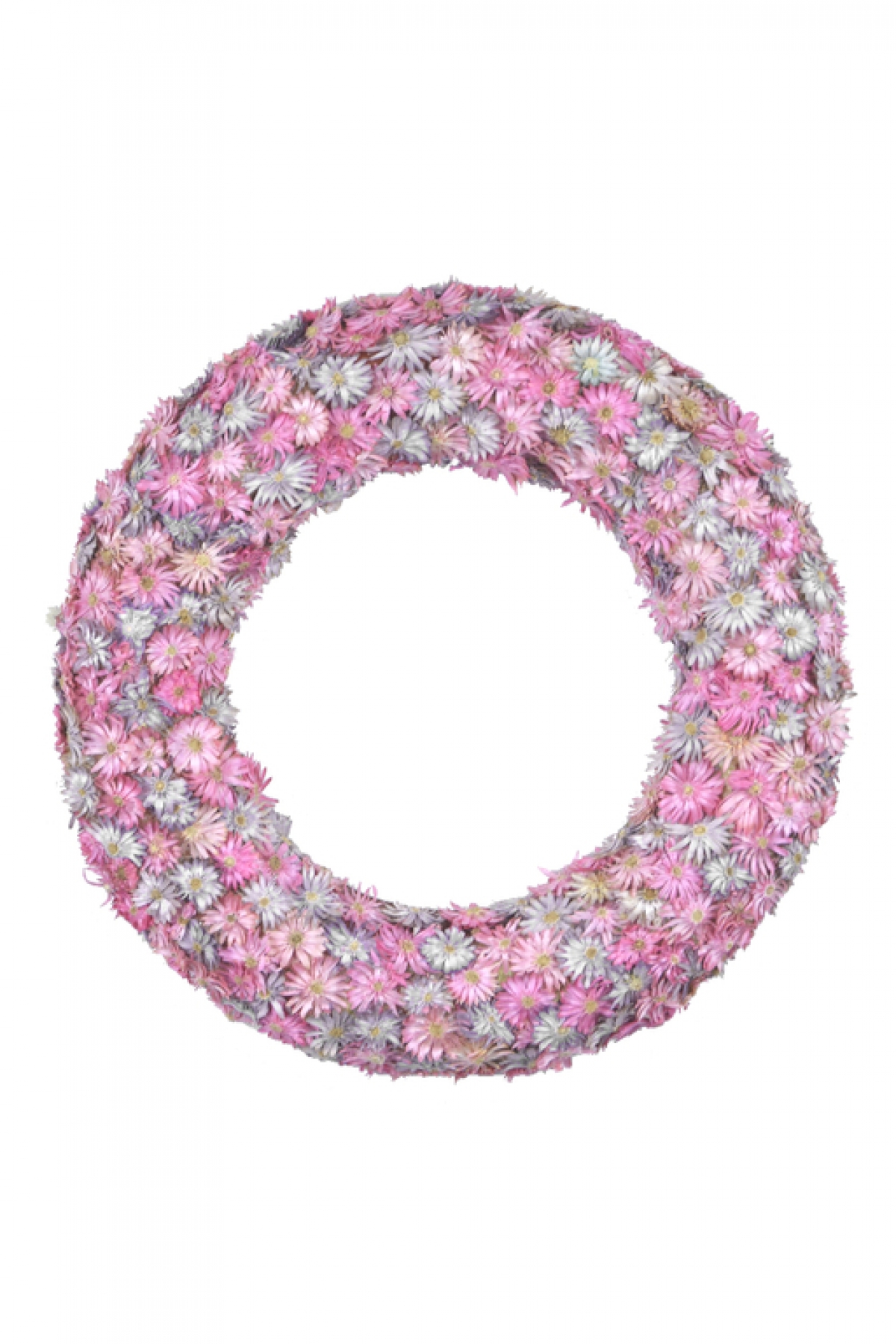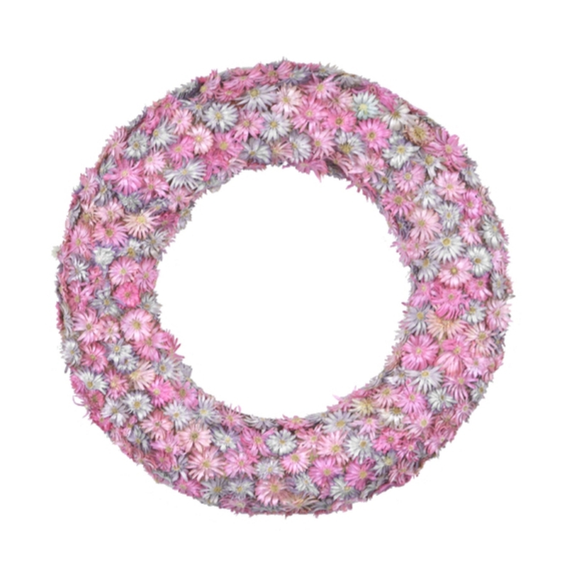 Pozimná dekorácia do okien vo forme venca zo sušených neskorých letných kvetov.