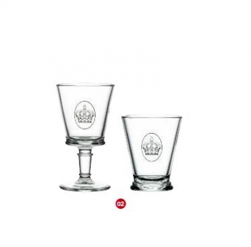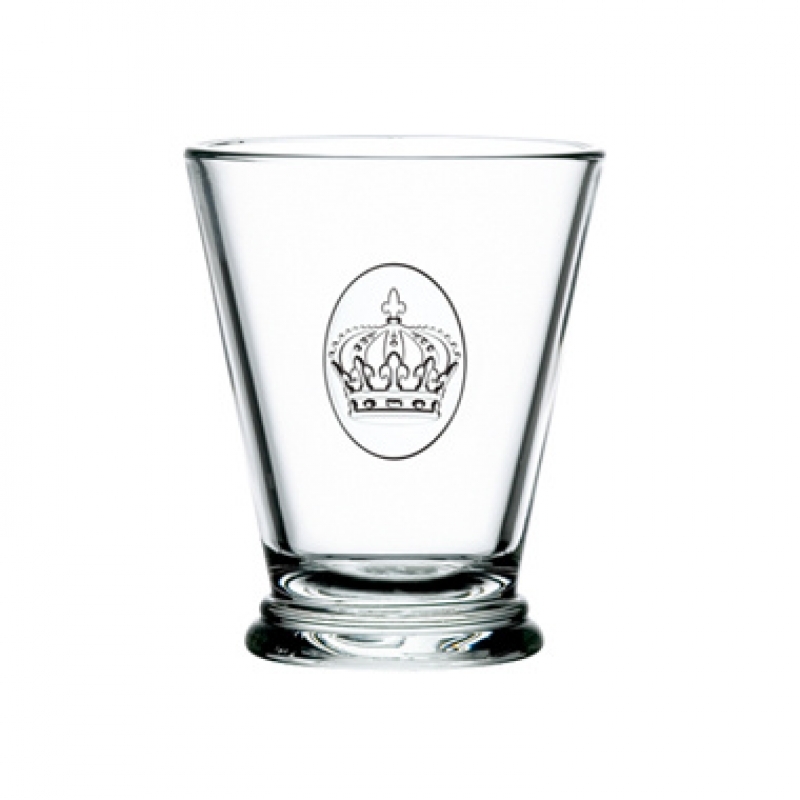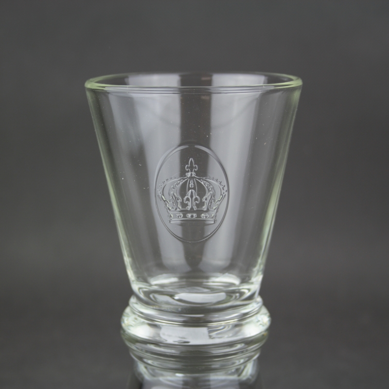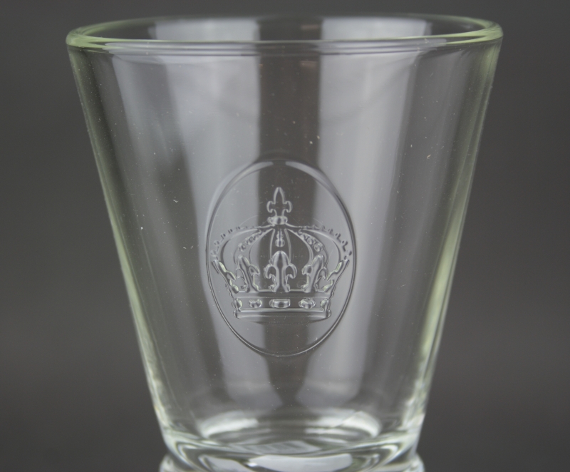Pohár na vodu alebo džús zdobená medailónom s motívom kráľovskej koruny. Stolové sklo z kolekcie sklárne La Rocher má typický francúzsky šarm. Spolu s riadom vnesiete kúsok Francúzska aj k Vám domov.