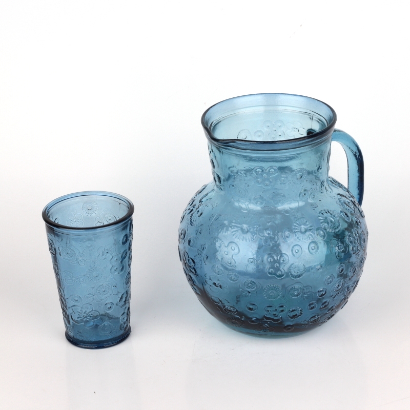 Modrá farba dodáva recyklovanému sklu na jedinečnosti. Kolekcia ponúka poháre, misky, džbán alebo veľkú misu v rovnakom dizajne.