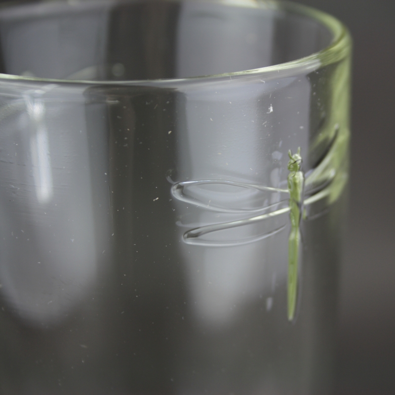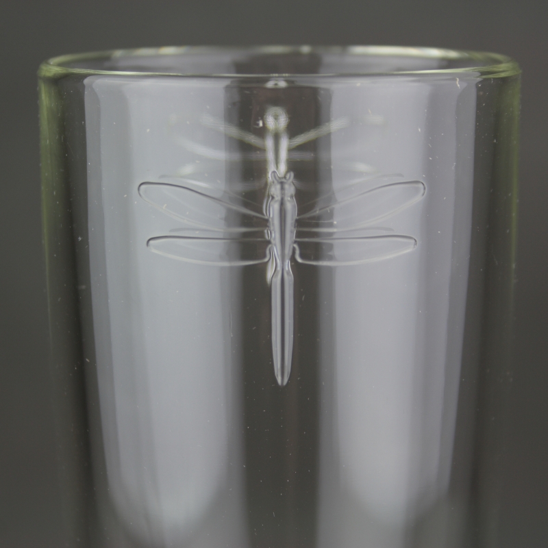 Poháre z lisovaného skla zdobená dvoma vážkami vo vidieckom štýle. lisovaného skla. Pohár je zdobená barokovým motívom kvetín, stoniek a mušlí.