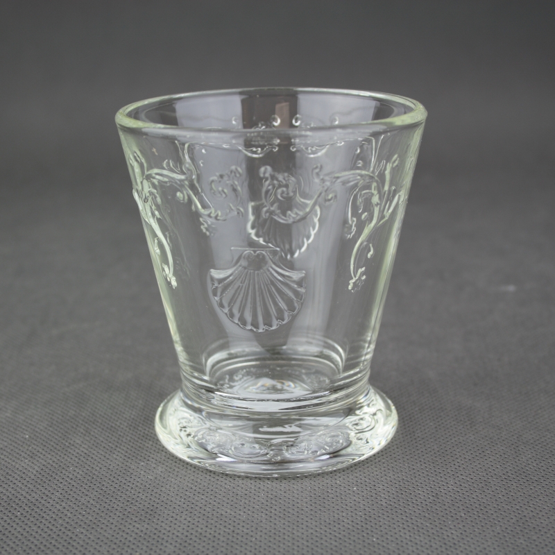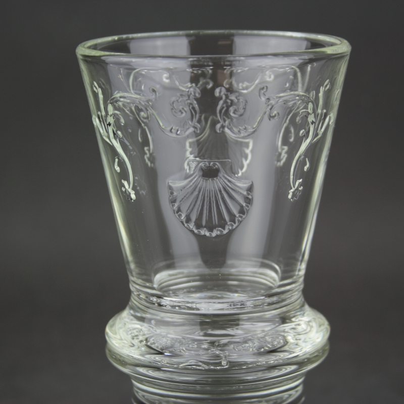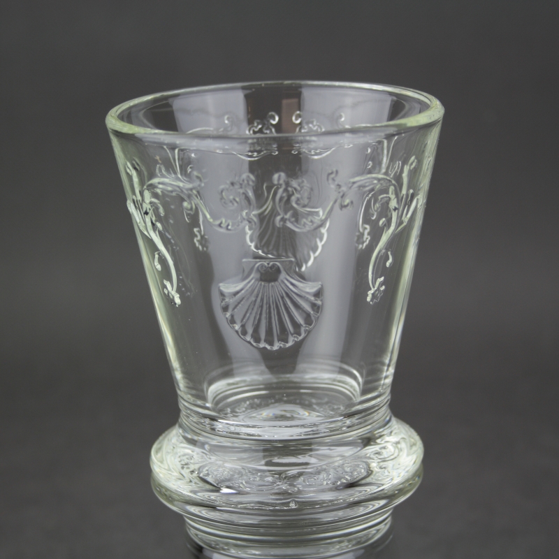 Väčší pohár na vodu alebo domácu limonádu. Vyrobená zo silného francúzskeho skla, zdobená barokovými kvietky, stonky a mušľami.