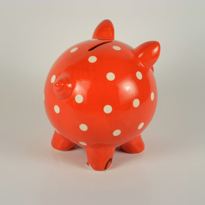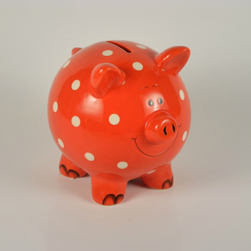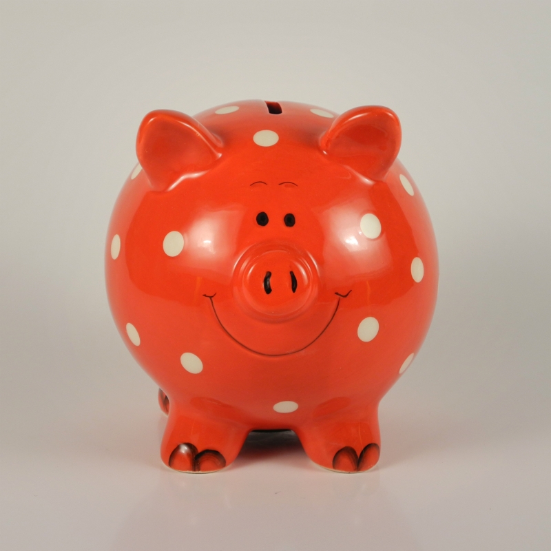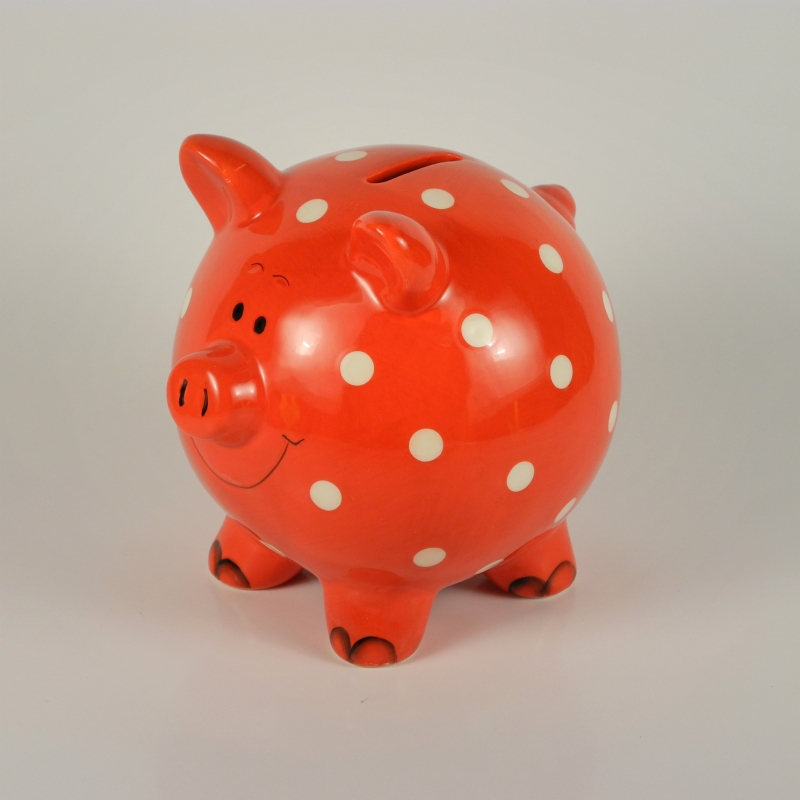 Pokladnička keramická - prasátko 18x16cm. Barva červená