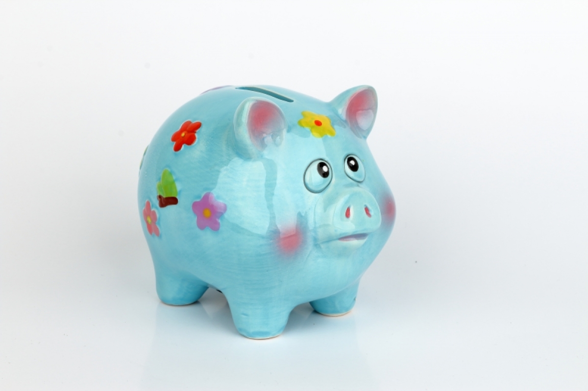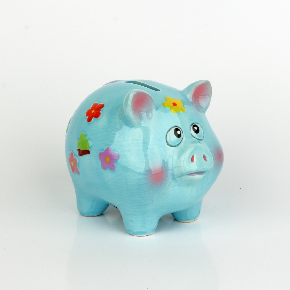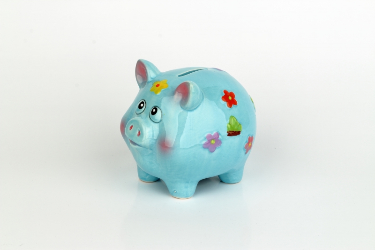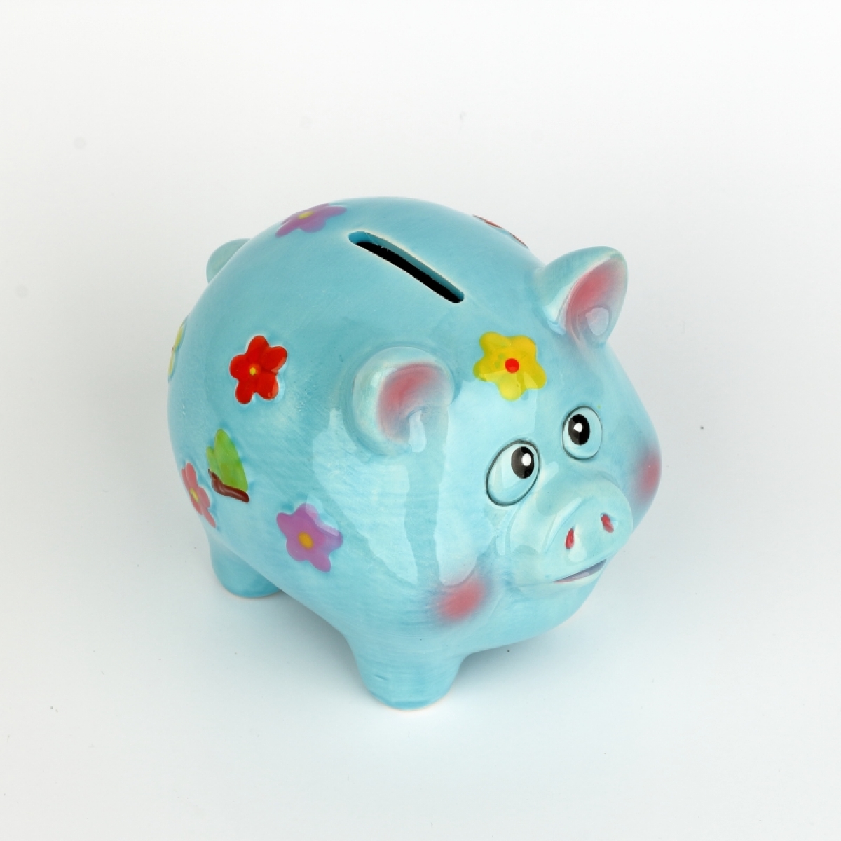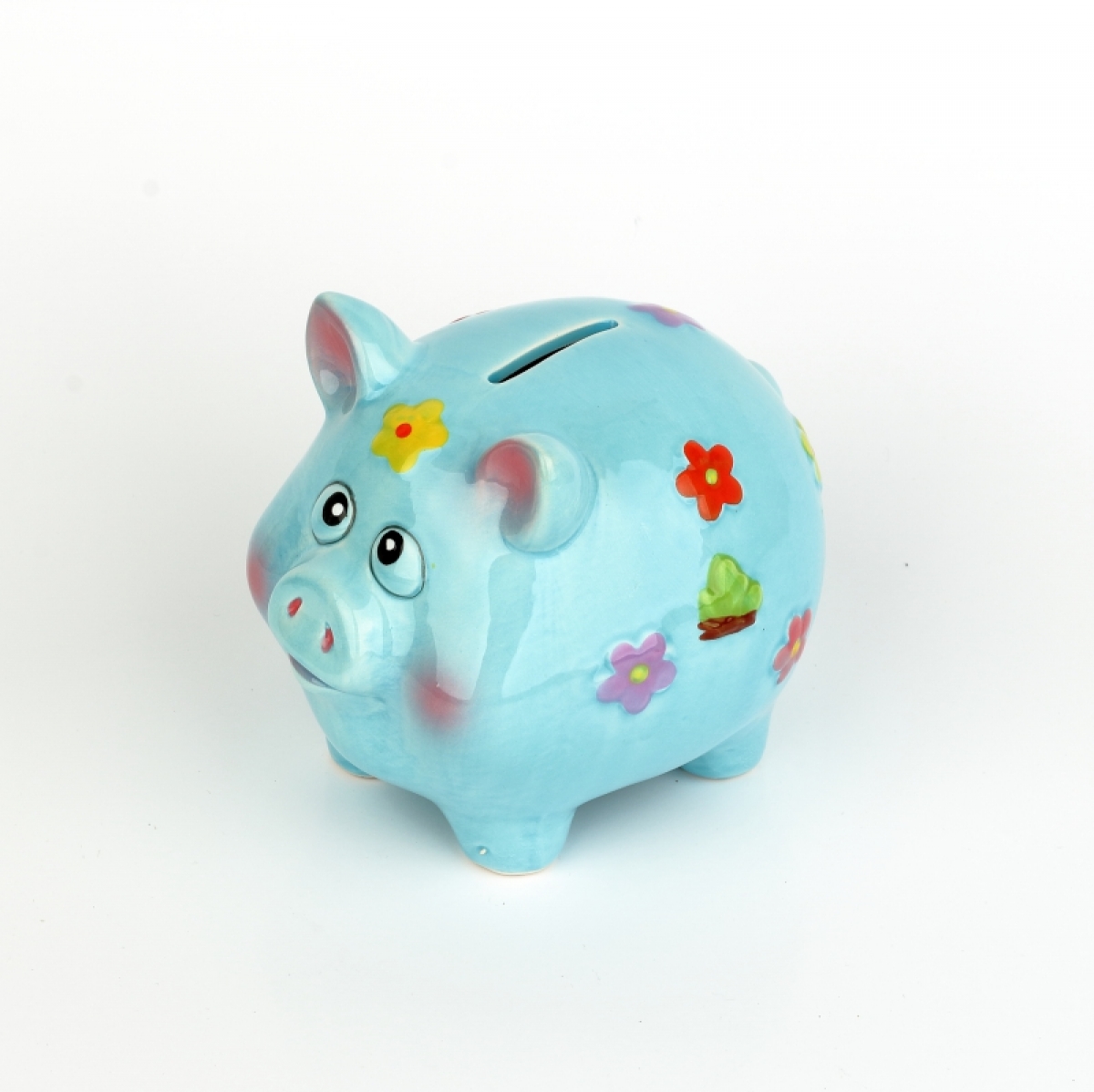 Pokladnička prasiatko vyrobená z keramiky a zdobená maľbou s glazúrou.