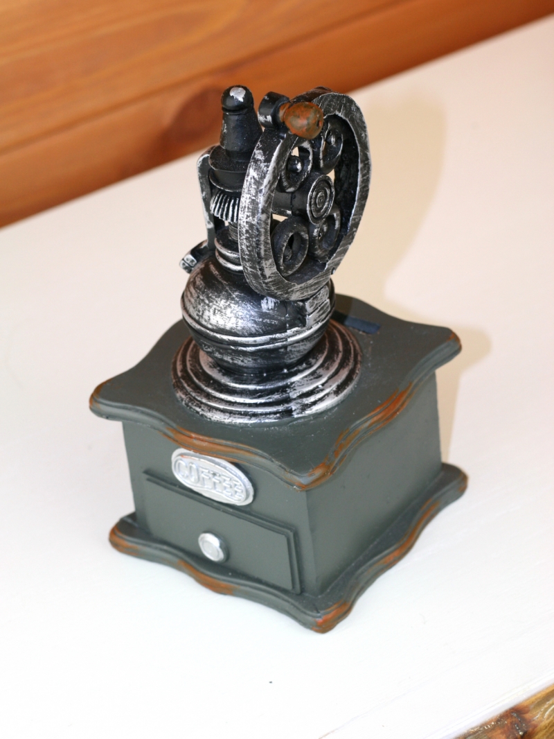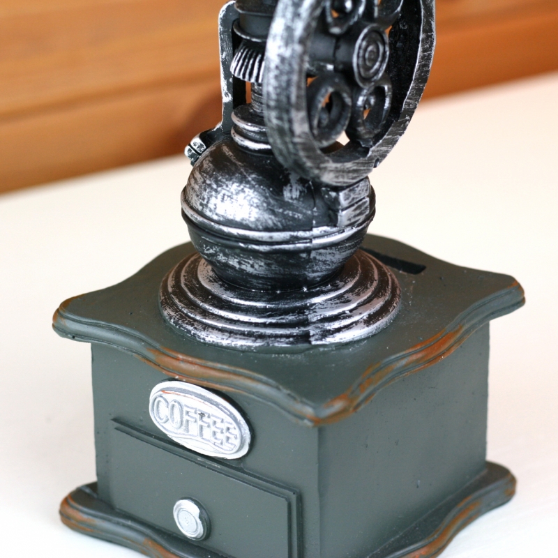 Pokladnička na peniaze v podobe ručného mlynčeku na Vás dýchne atmosférou starých dobrých časov.