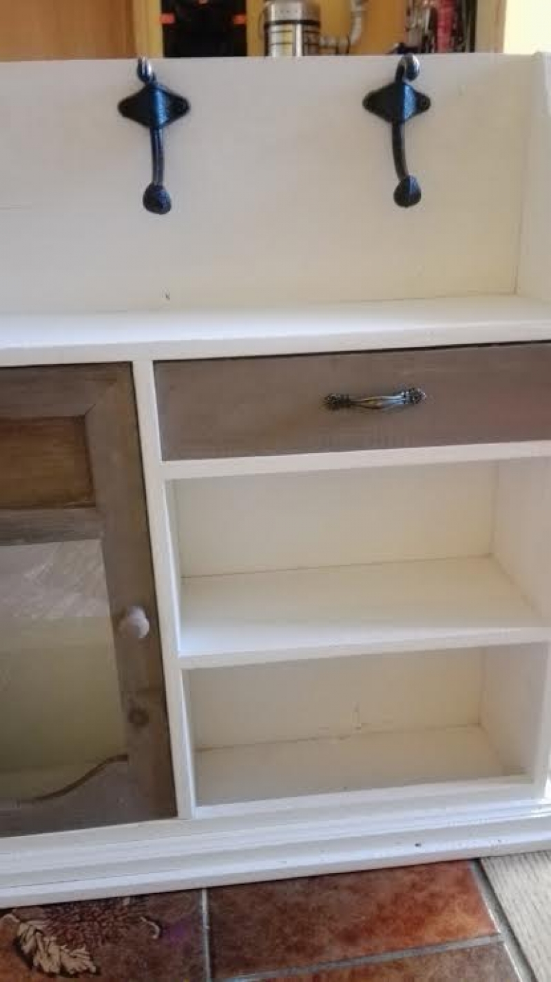 Polica do kuchyne v bielej farbe s hornou ozdobnou lištou, vyrobená z recyklovaného dřeva. Biela farba dreva je v príjemnom kontraste s dvierkami a šuplíčky, ktorý má prírodnú farbu dreva. V spodnej časti sú tri kovové háčiky.