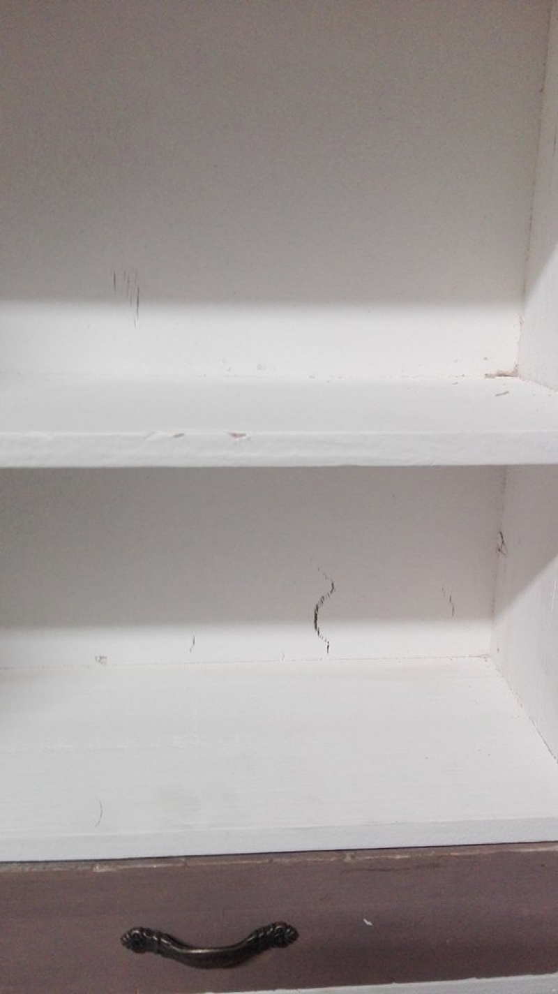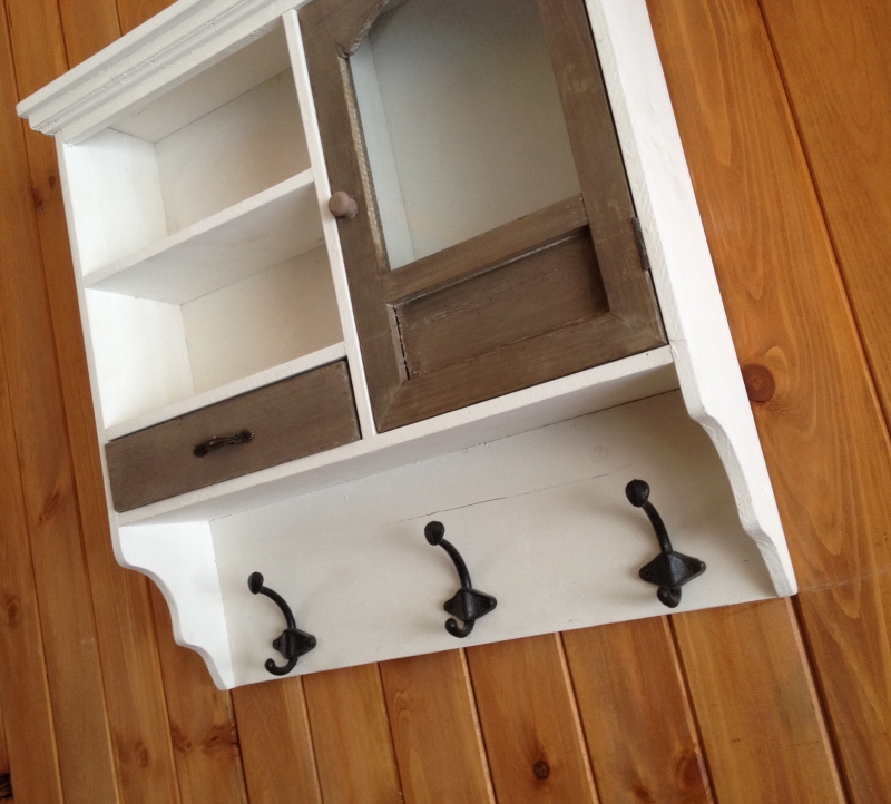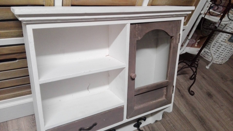 Polica do kuchyne v bielej farbe s hornou ozdobnou lištou, vyrobená z recyklovaného dřeva. Biela farba dreva je v príjemnom kontraste s dvierkami a šuplíčky, ktorý má prírodnú farbu dreva. V spodnej časti sú tri kovové háčiky.